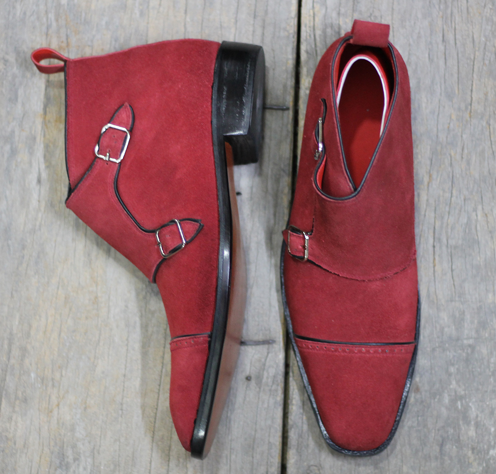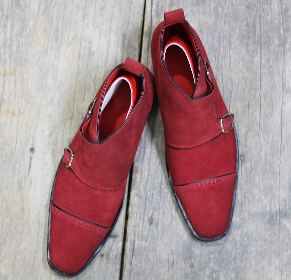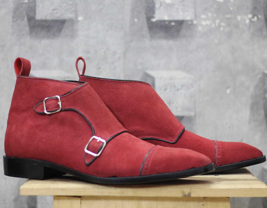 Men's Handmade Maroon Cap Toe Double Monk Strap Suede Shoes