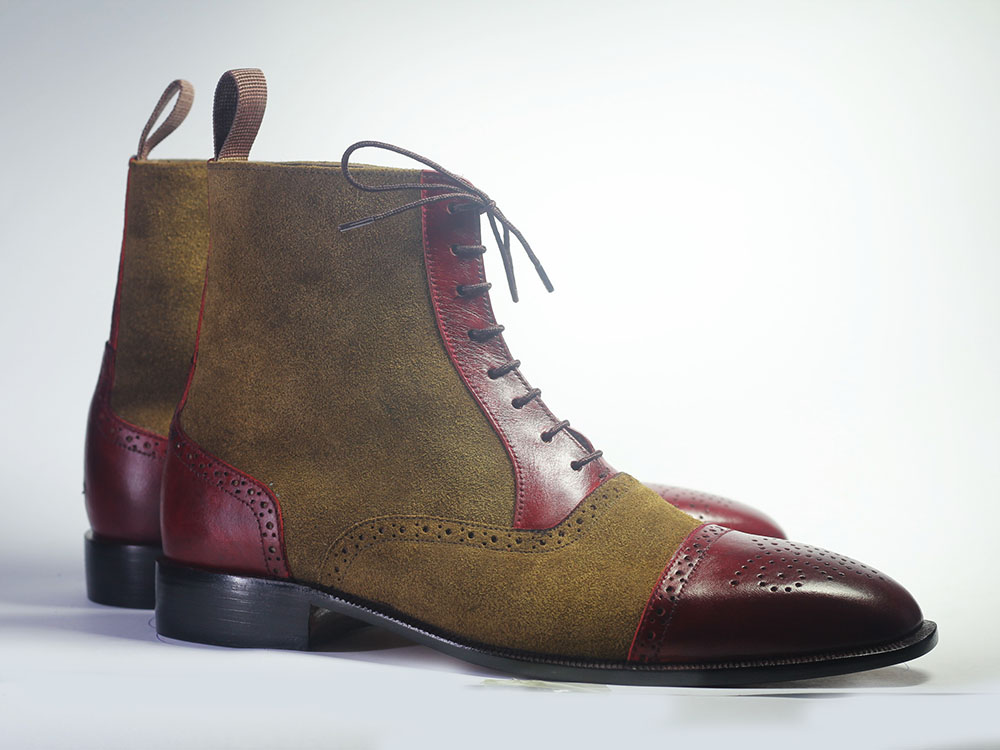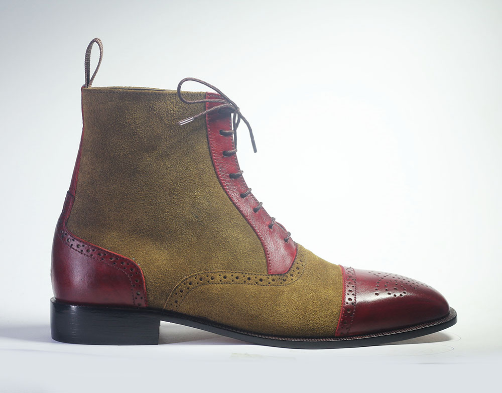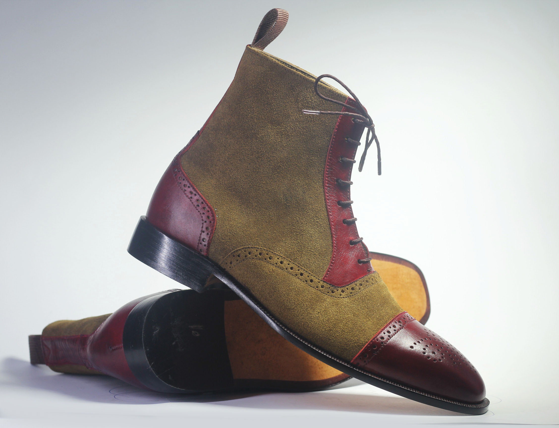 Men's Handmade Ankle High Brown Burgundy Cap Toe Brogue Leather Suede Lace Up Boot