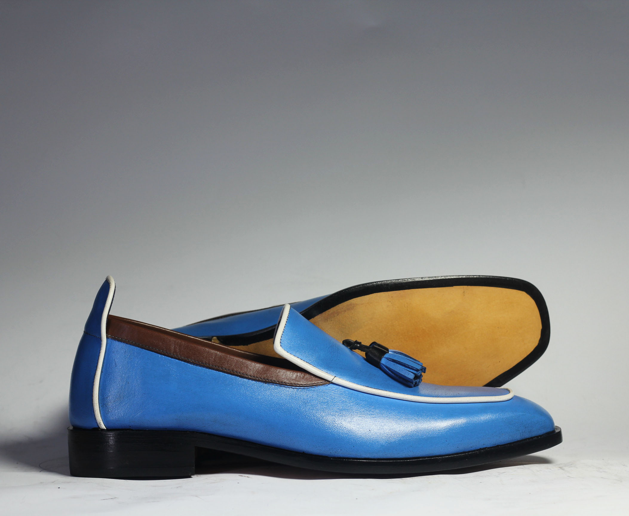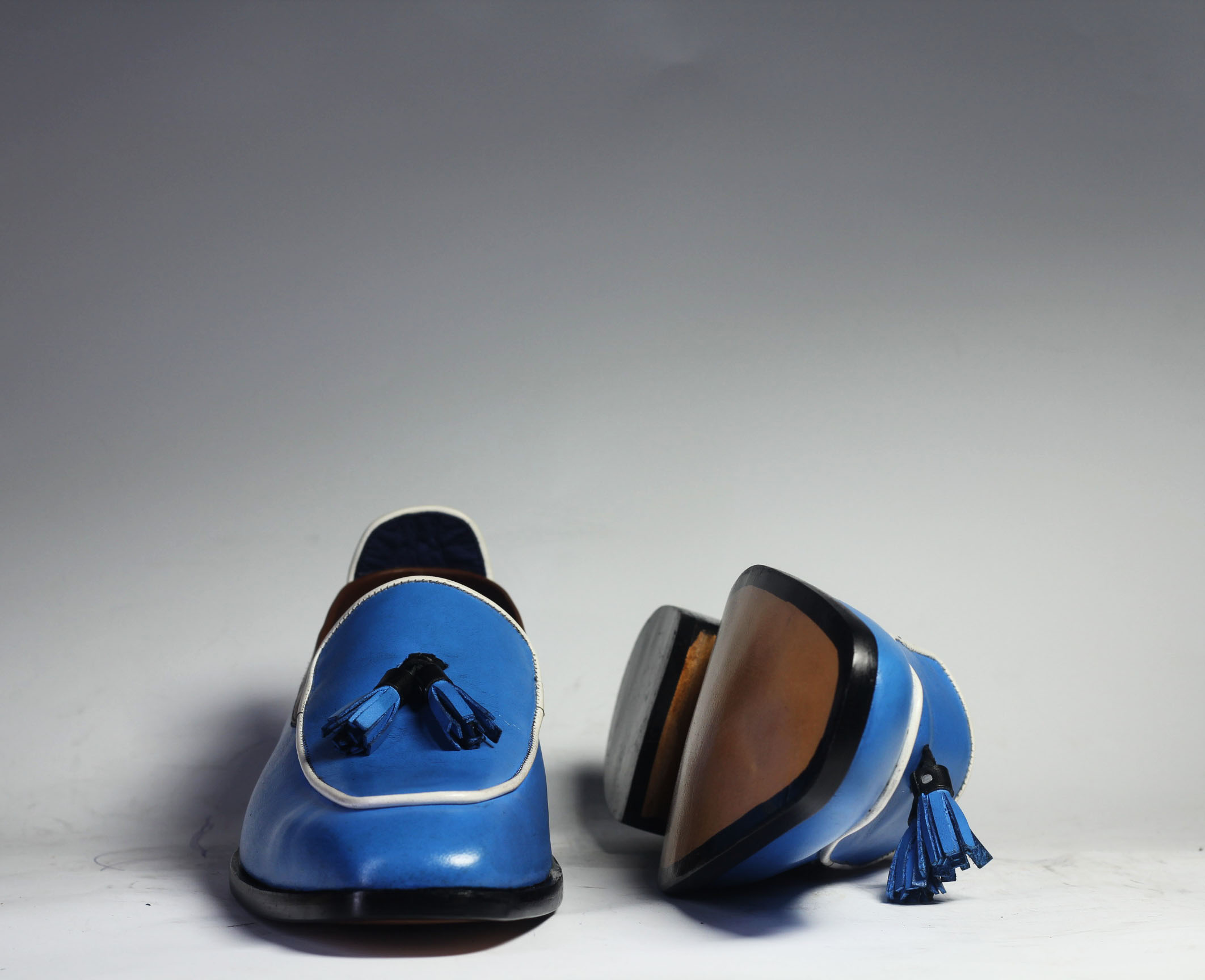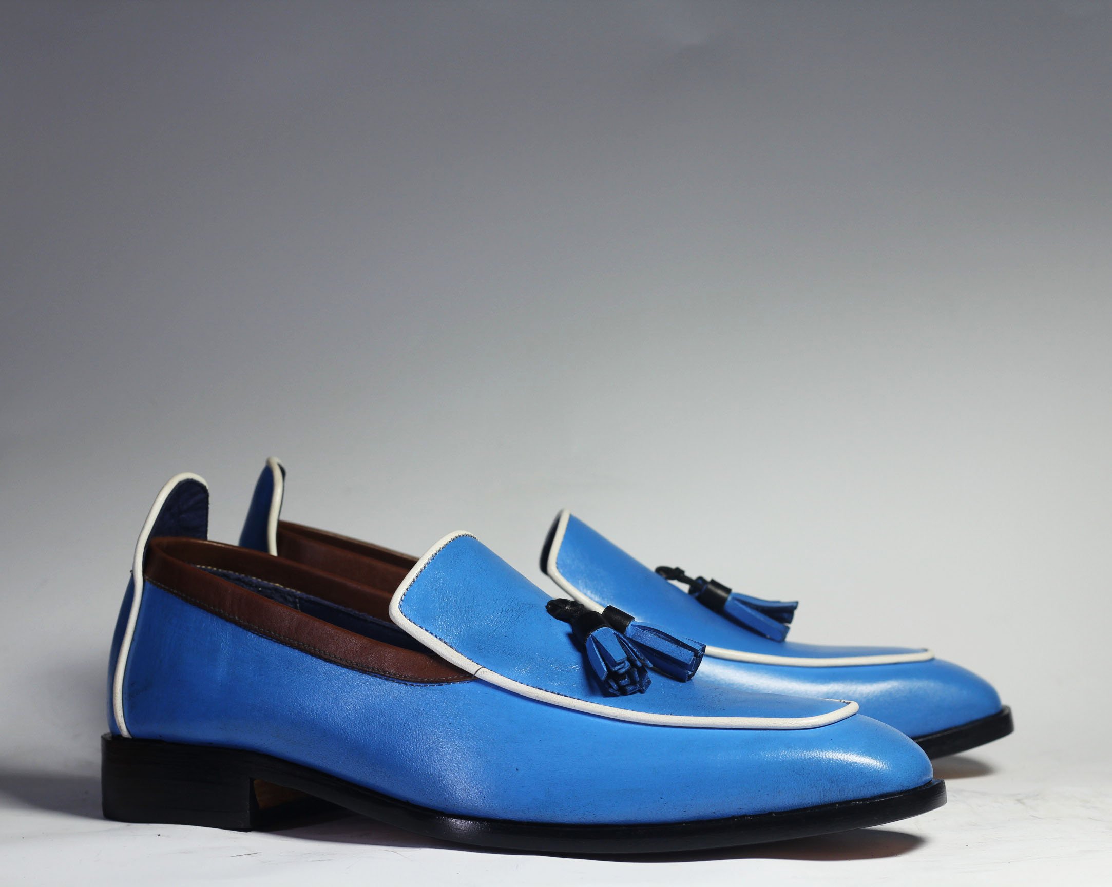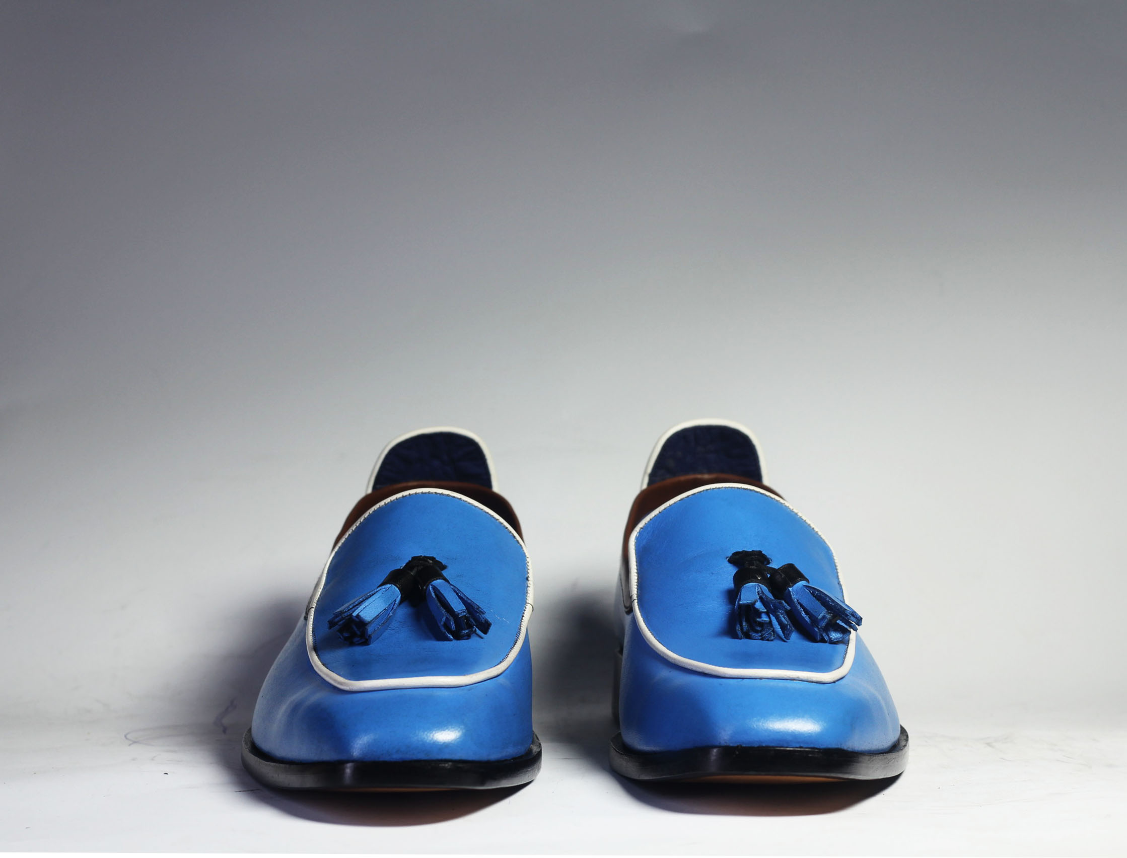 Handmade Blue Tussles Loafer Leather Shoes For Men's