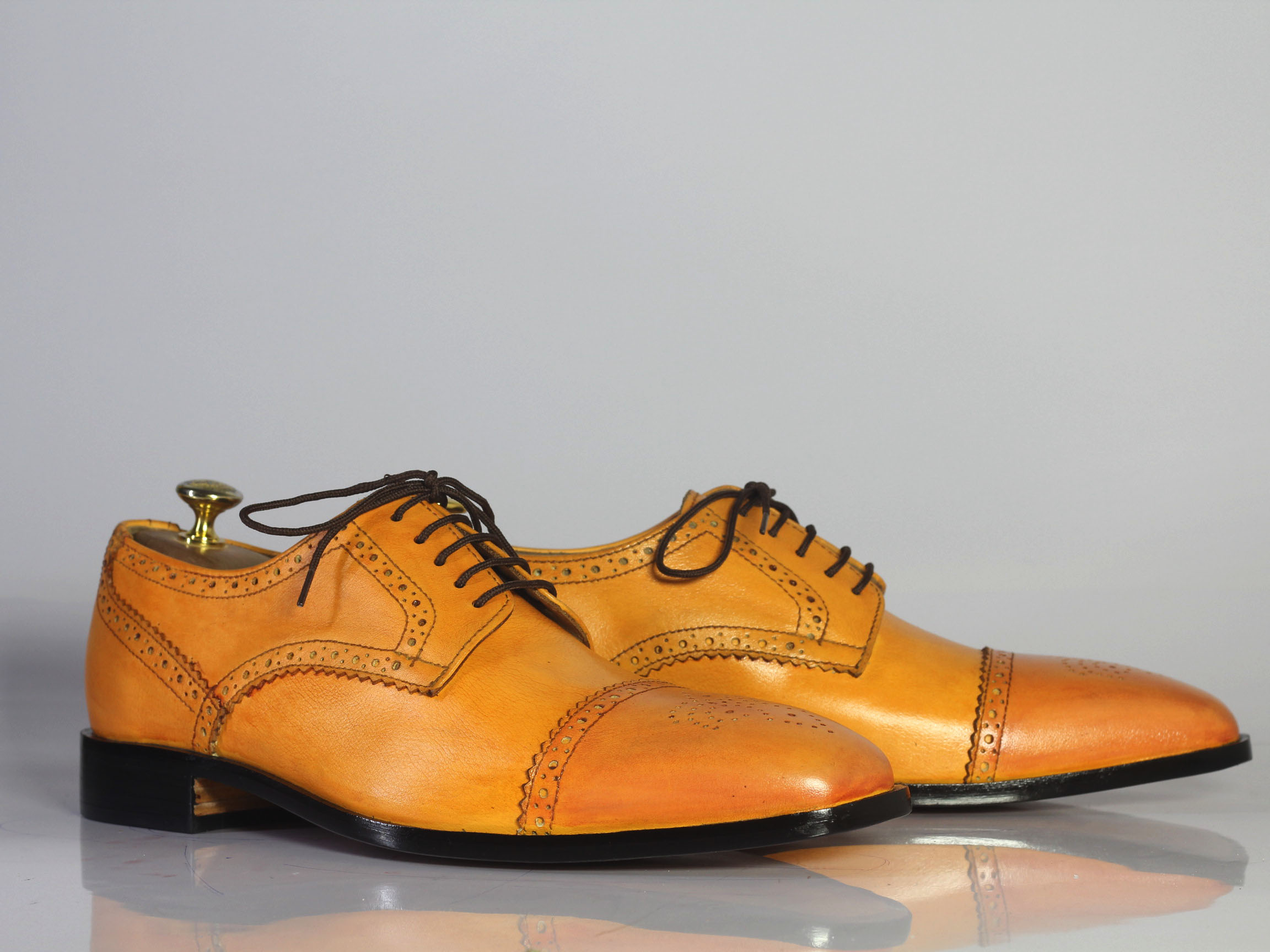 Handmade Tan Shoes, Men's Cap Toe Brogue Formal Cap Toe Leather Shoes