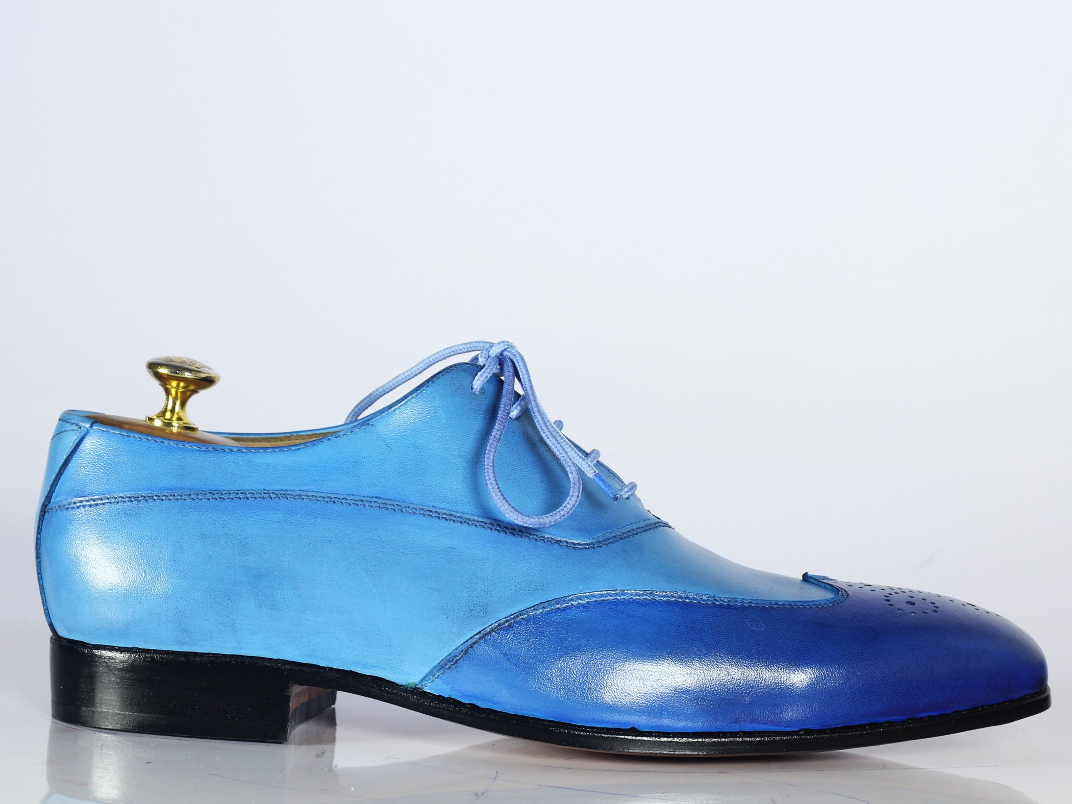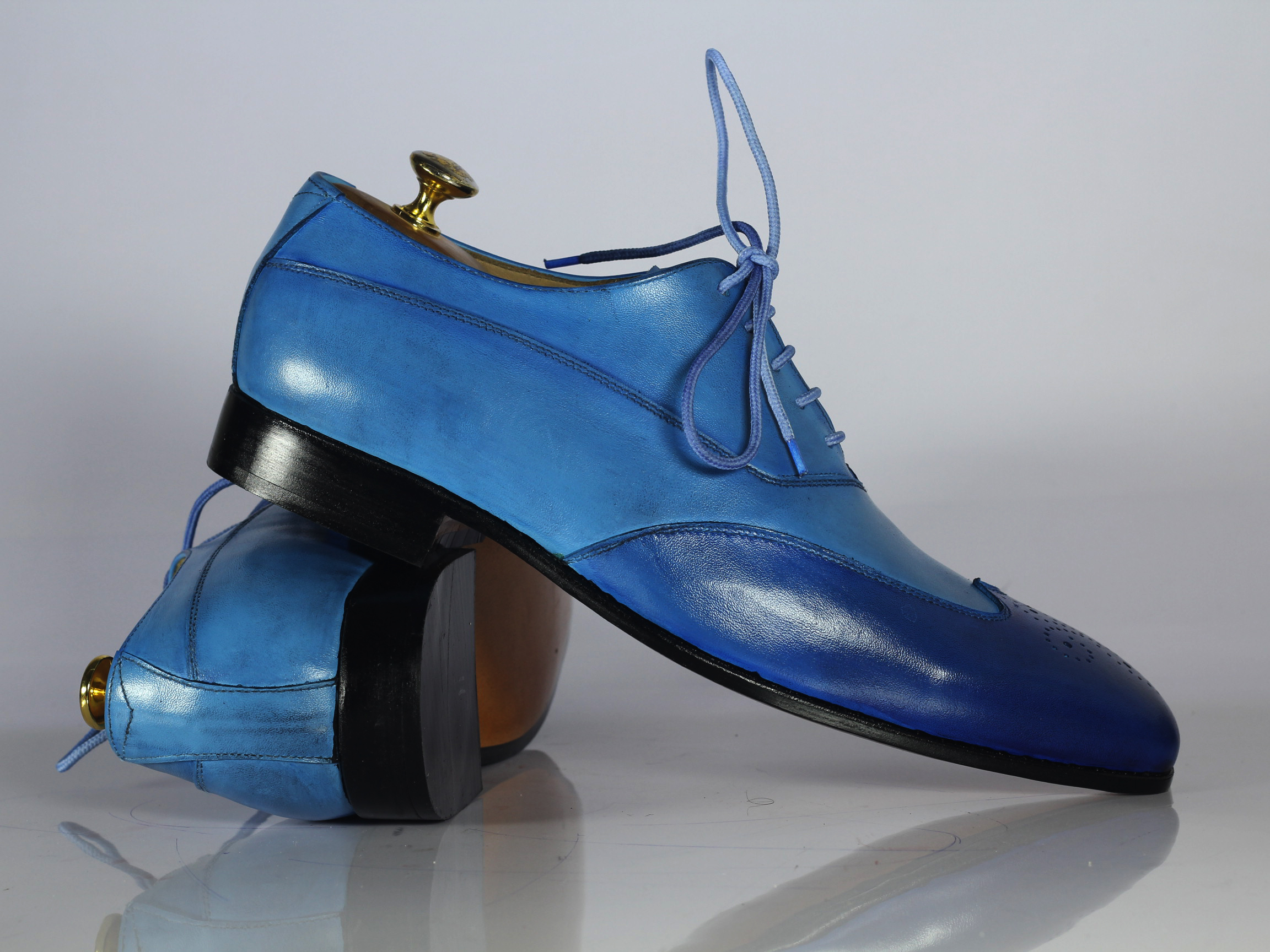 Handmade Blue Wing Tip Brogue Shoes Stylish Leather Lace Up Shoes For Men's