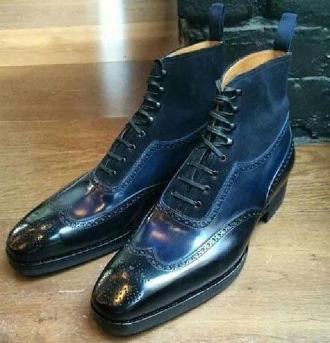 Men Hand stitched Blue Leather Suede Boots,Leather formal wing tip Ankle boot