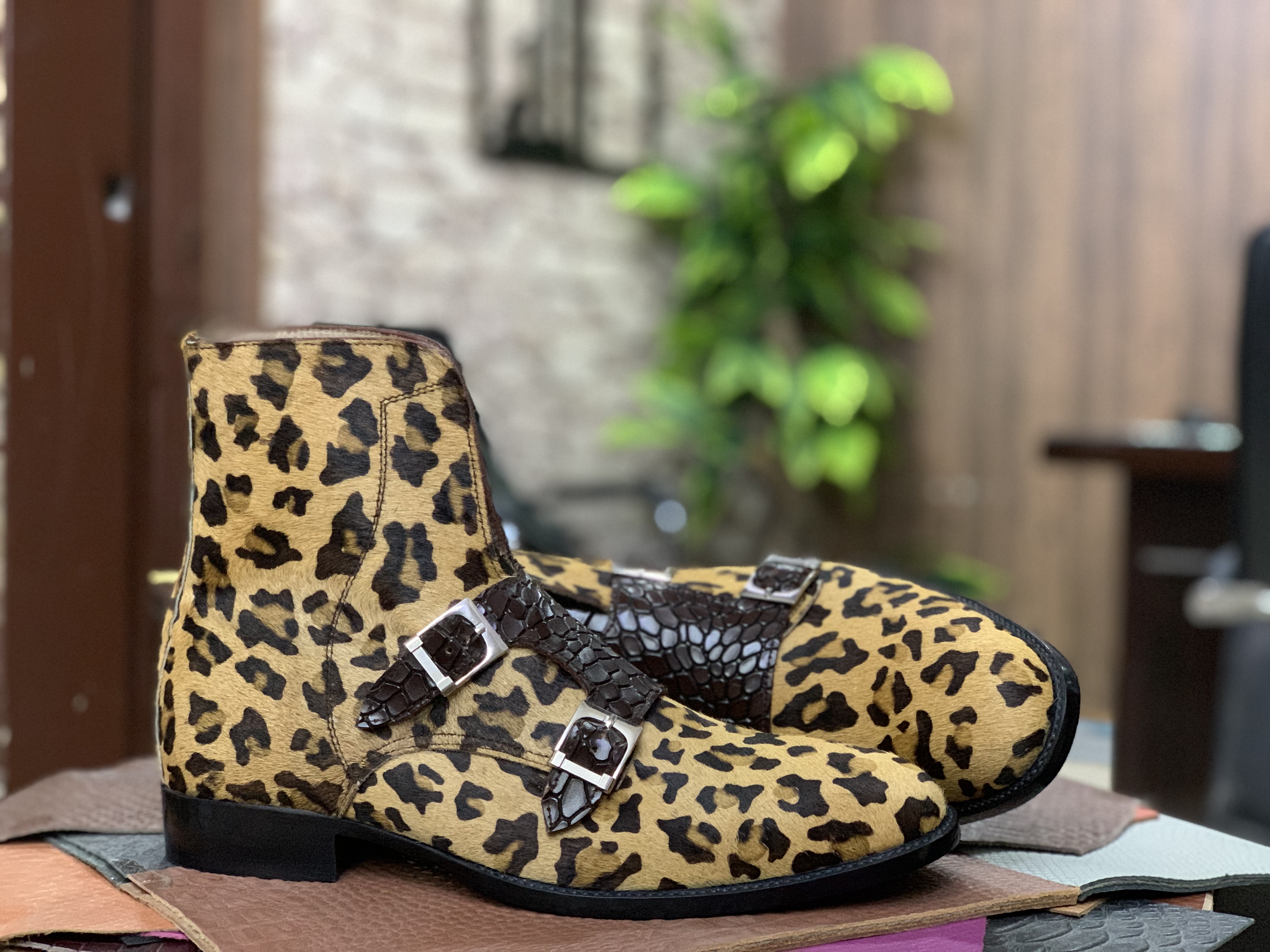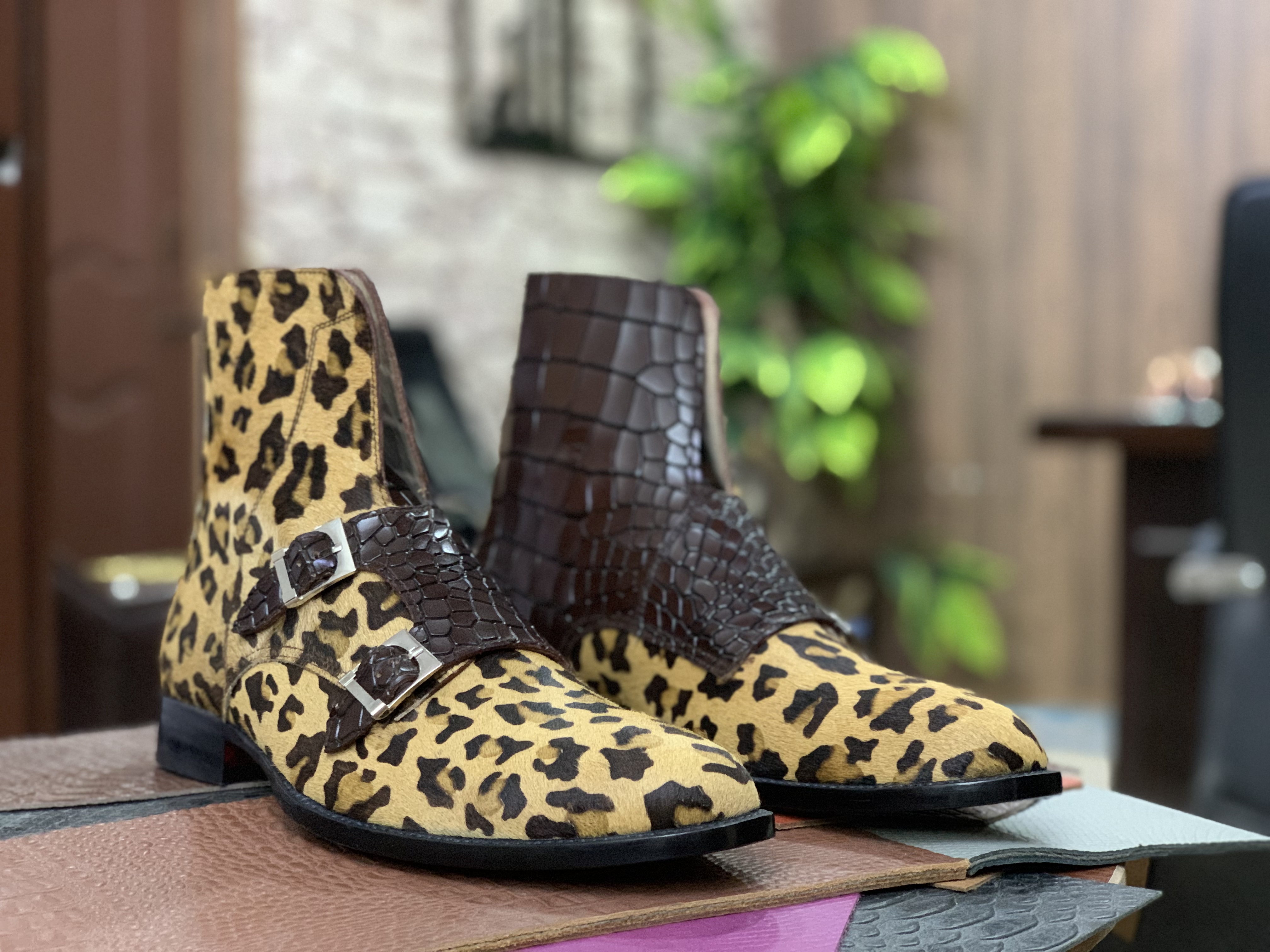 Men's Leopard Hair Skin & Alligator Print Leather Boot, Handmade Double Monk Leather Stylish Boot