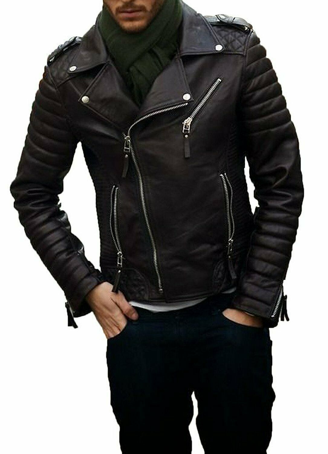 New Men Quilted Leather Jacket 100% Genuine Soft Cowhide Biker Bomber
