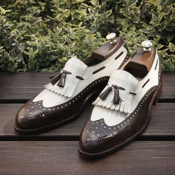 Handmade Men's Wing Tip Shoes, Dark Brown & White Leather Loafer Tussels Shoes