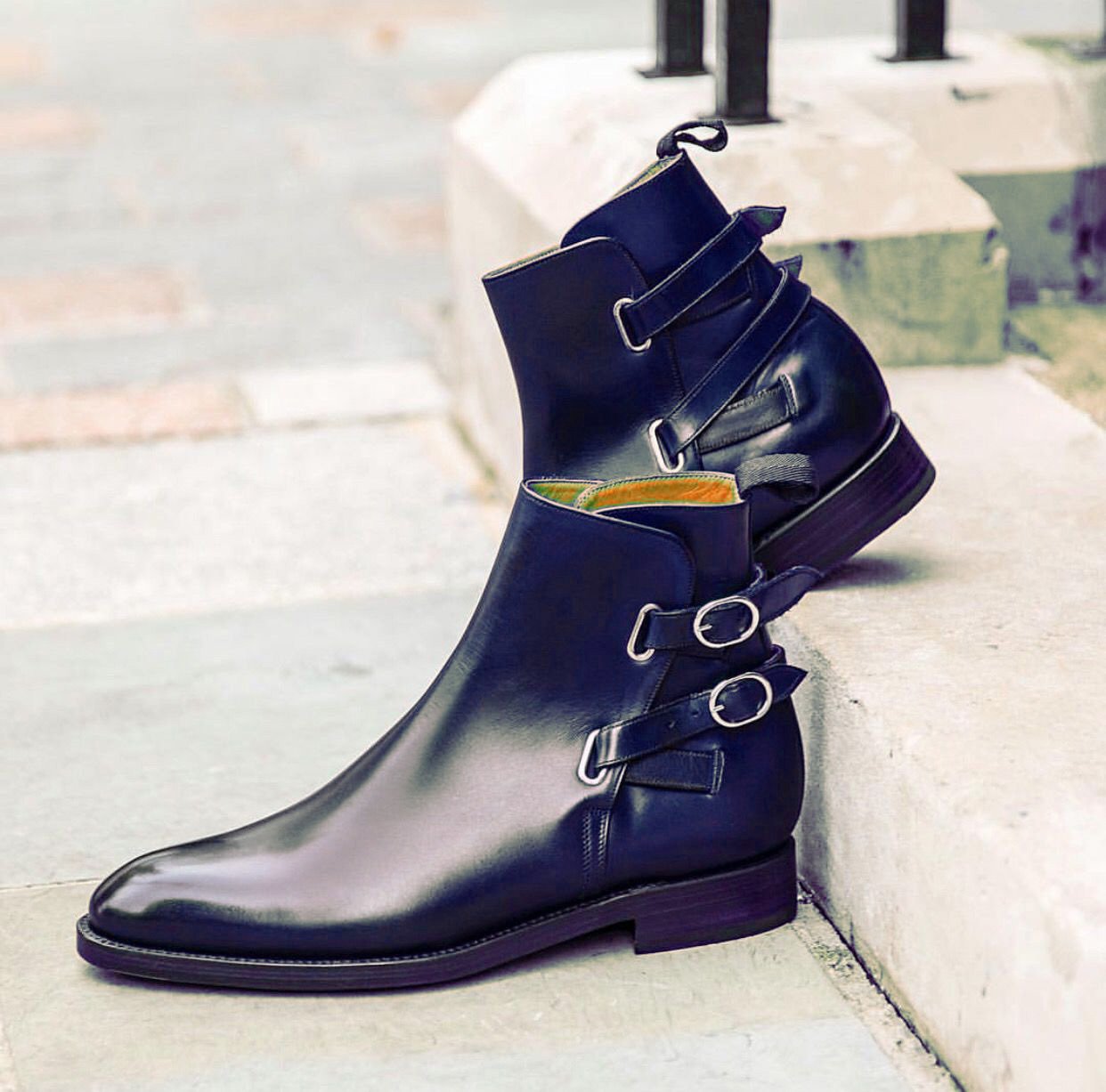 Handmade Men's Buckle Boot, Men's Black Color Leather Double Buckle Casual Fashion Boot.