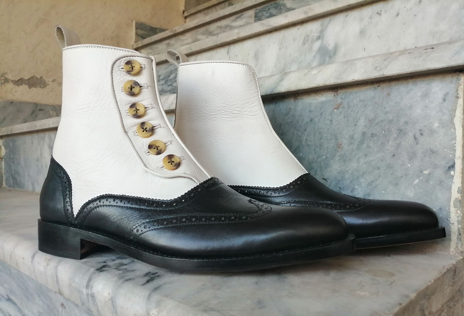 Handmade Men's Wing Tip Brogue Leather Boot, Men's Black White Ankle High Button Top Boot