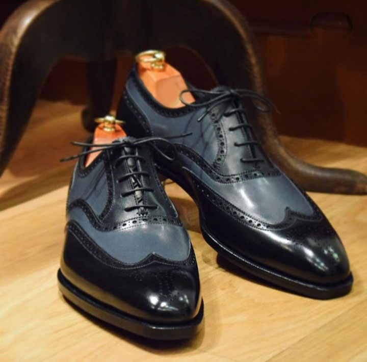 Handmade Men's Lace Up Brogue Shoes, Men's Gray Black Leather Wing Tip Shoes