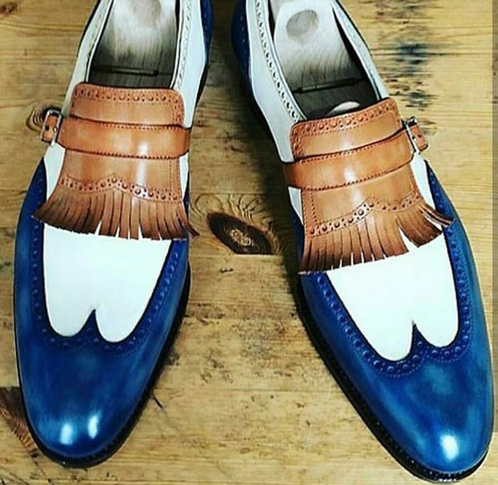 Handmade Men's Fringe Wing Tip Shoes, Men's Blue White Leather Shoes