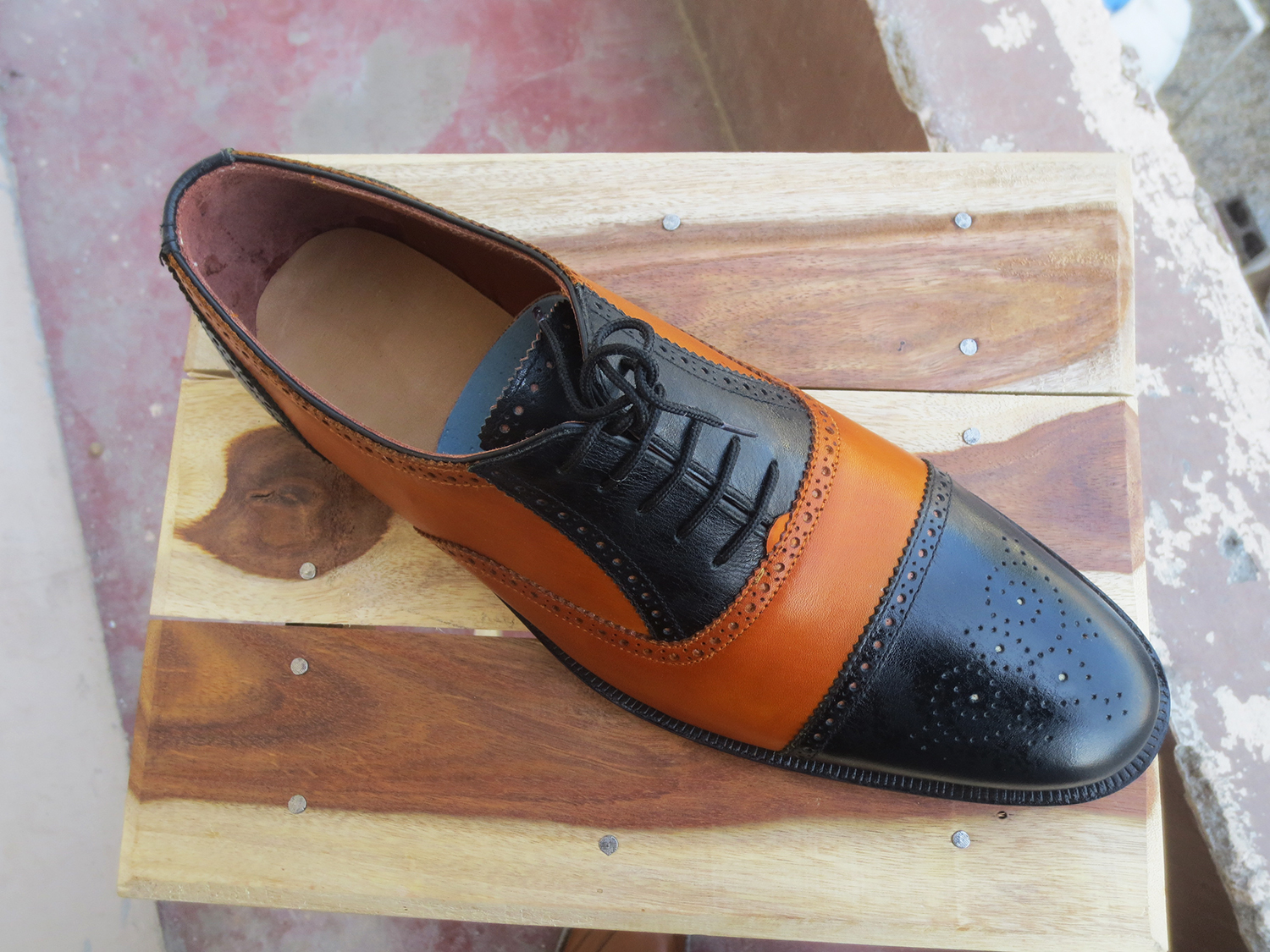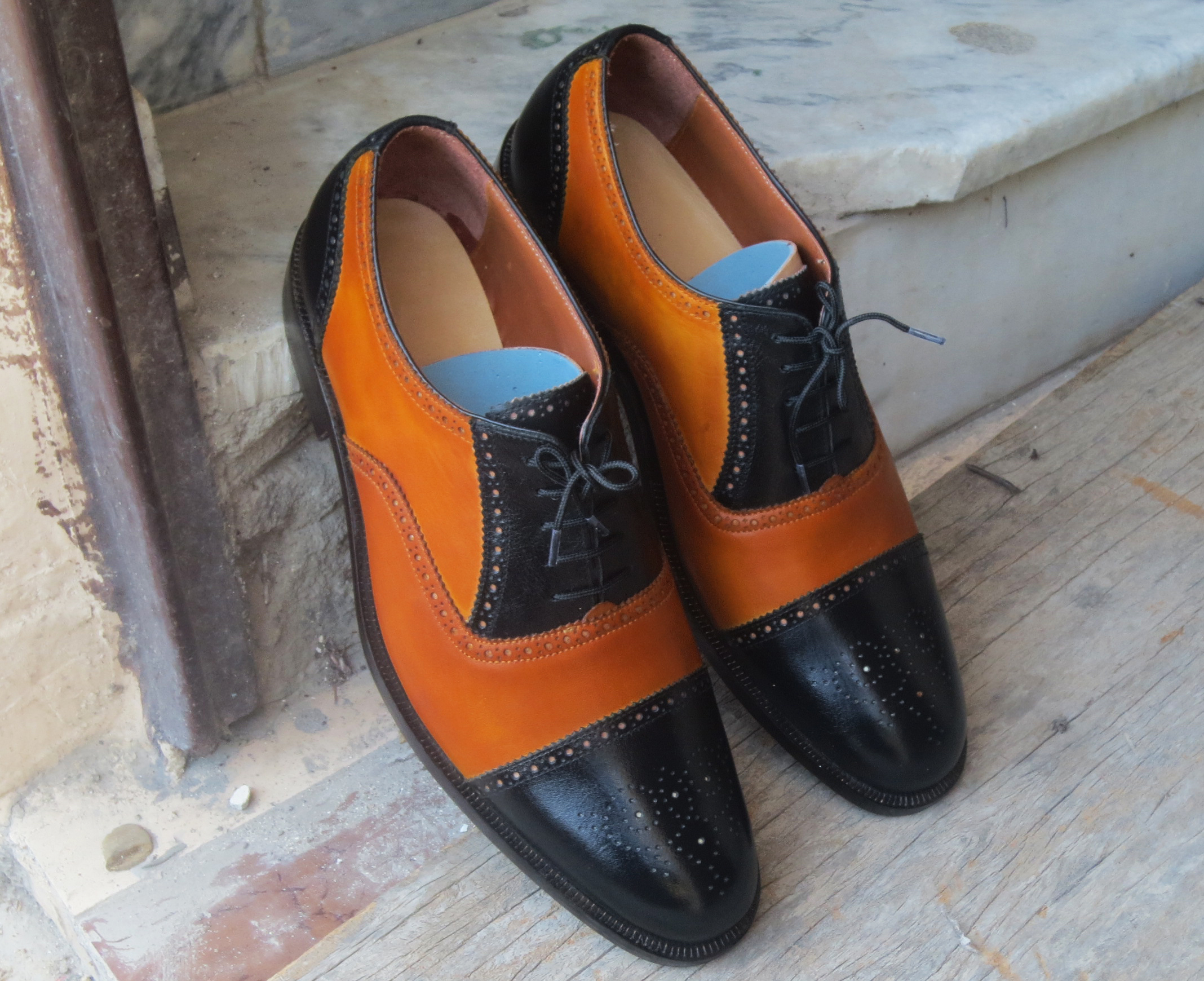 New Handmade Men Cap Toe Brogue Tan & Black Leather Dress Formal Lace Up Shoes