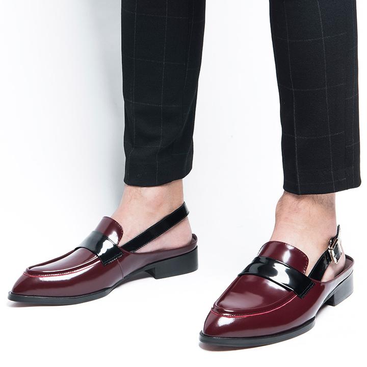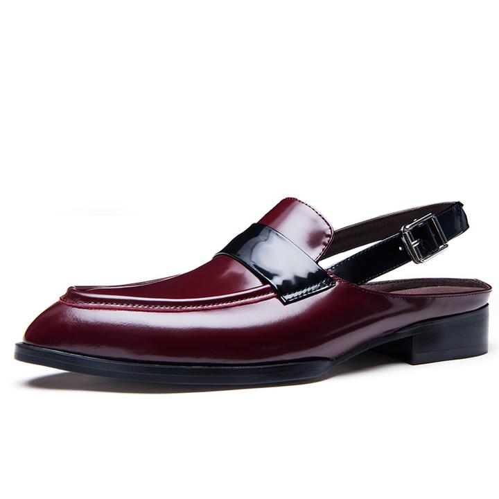 Handmade Men Burgundy & Black Open Strap Calf Leather Dress Penny Open Loafers