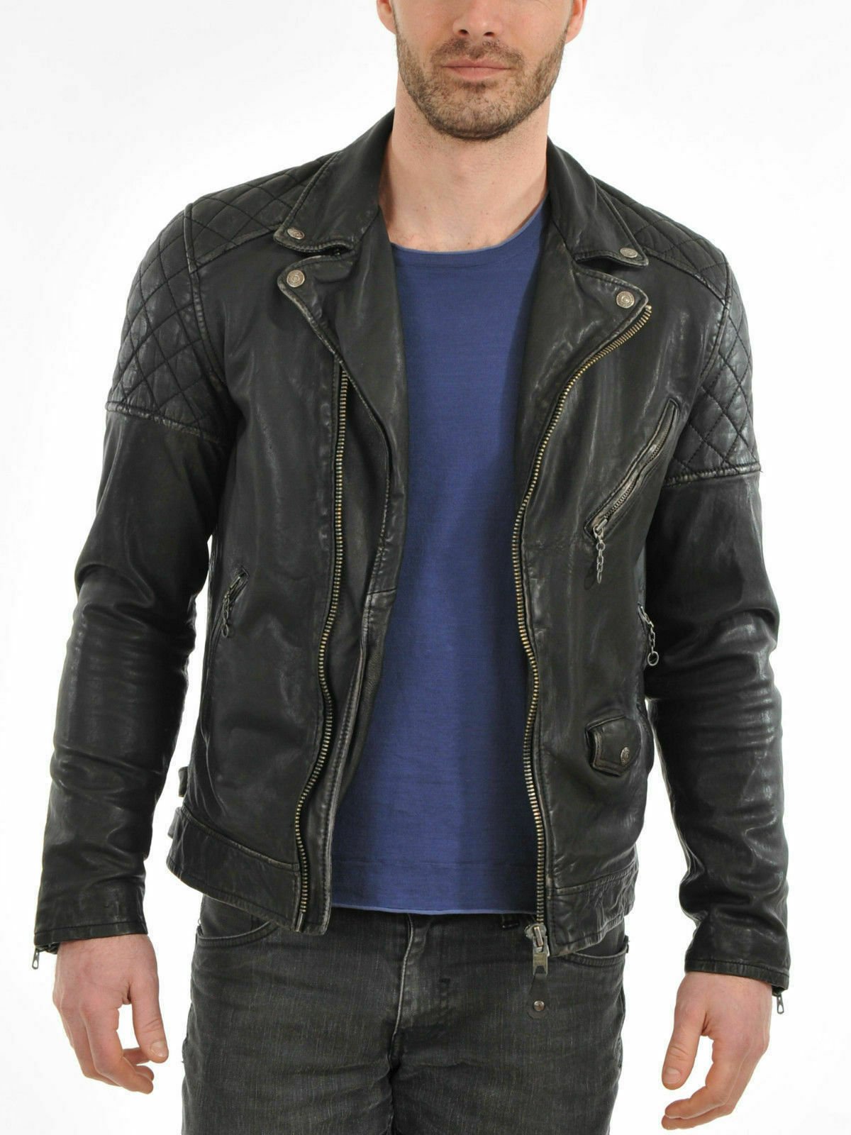FEATURE:Oblique Zip Front,Turn Down Collar,Classic Brando Biker Jacket with Belt, Studded Lapels, Epaulettes & Zipped Cuffs
