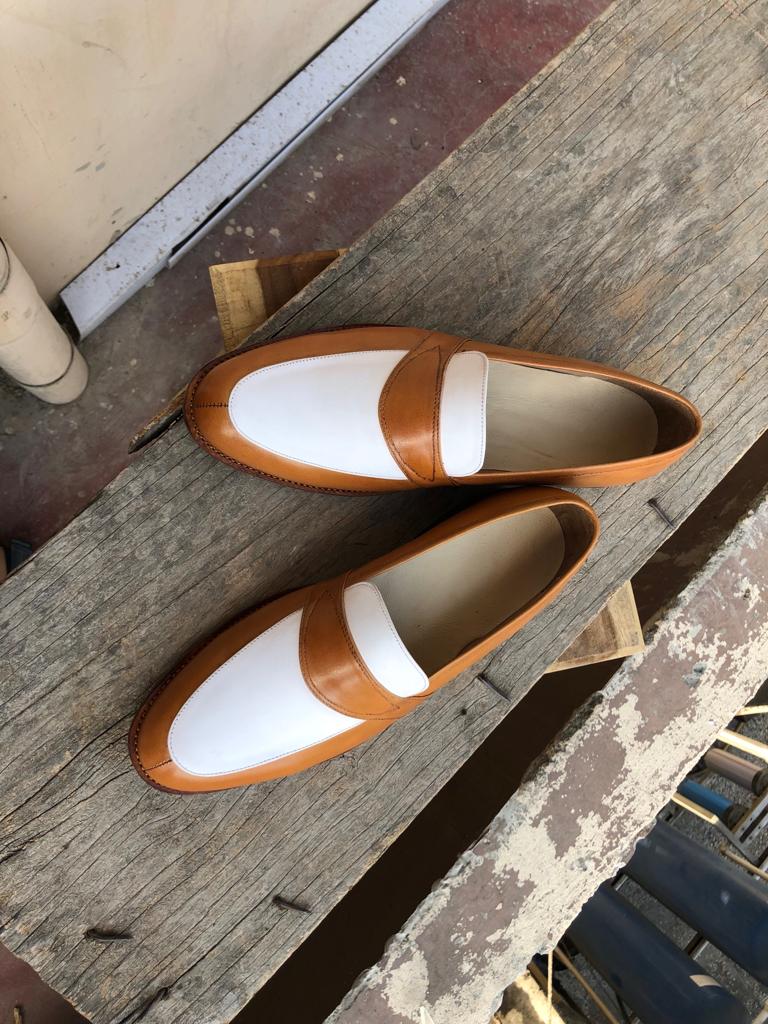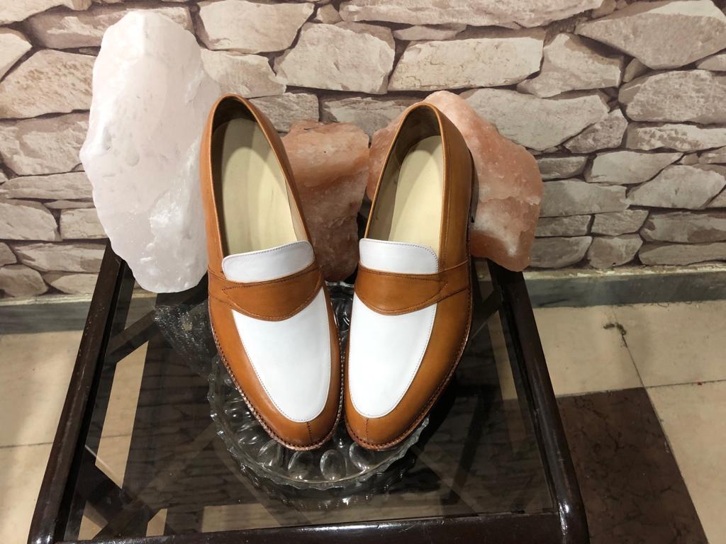 Handmade Men's Brown White leather Split Toe Slip On Loafers shoes