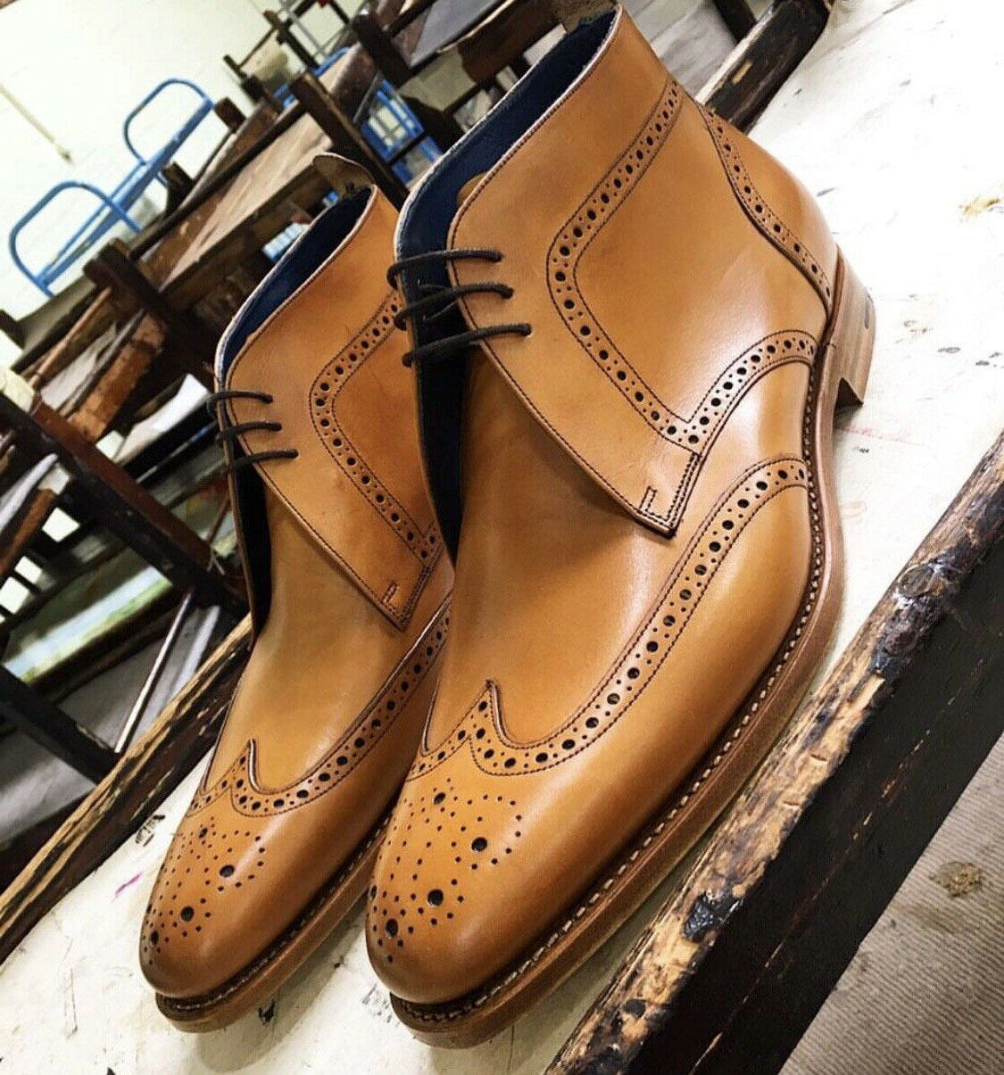 Handmade Pure Leather Tan Brogue Chukka Boots for Men's
