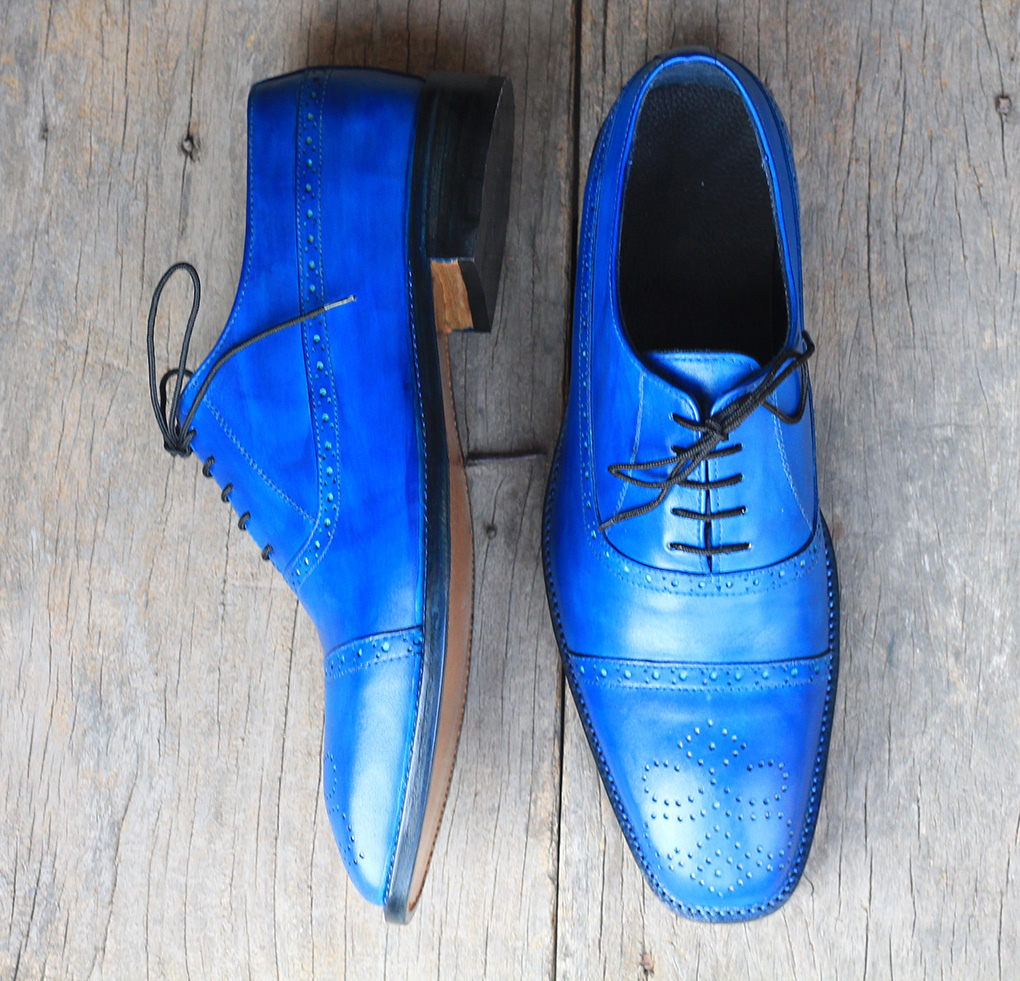 Men's Handmade Blue Color Leather formal shoes, Men's Cap Toe Brogue Lace Up Shoes