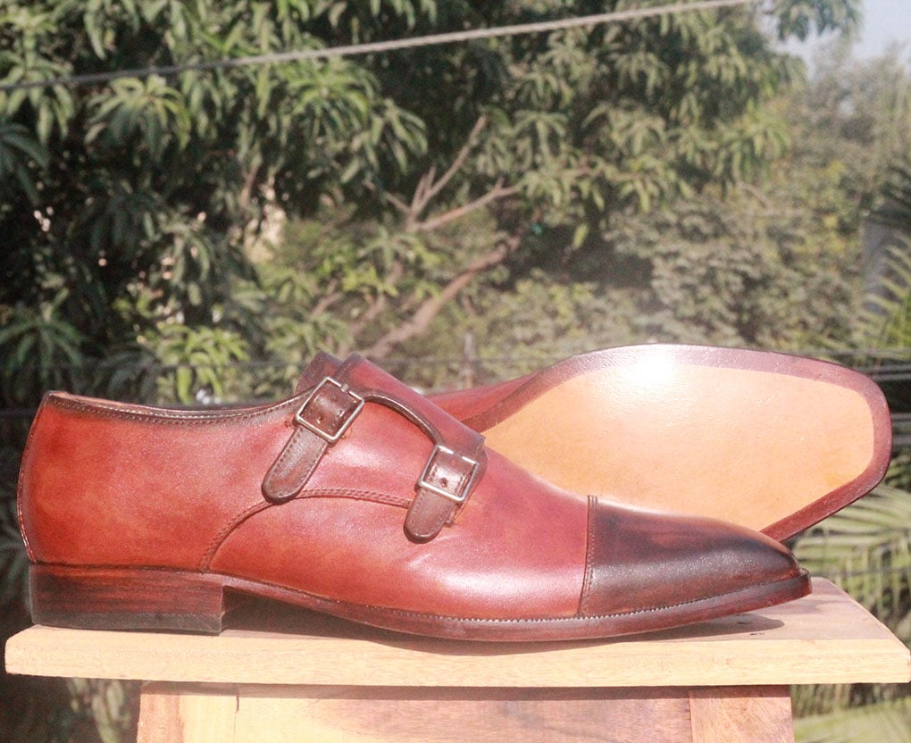 Handmade Two Shaded Brown Leather shoes, Men's Cap Toe Double Monk Formal Shoes