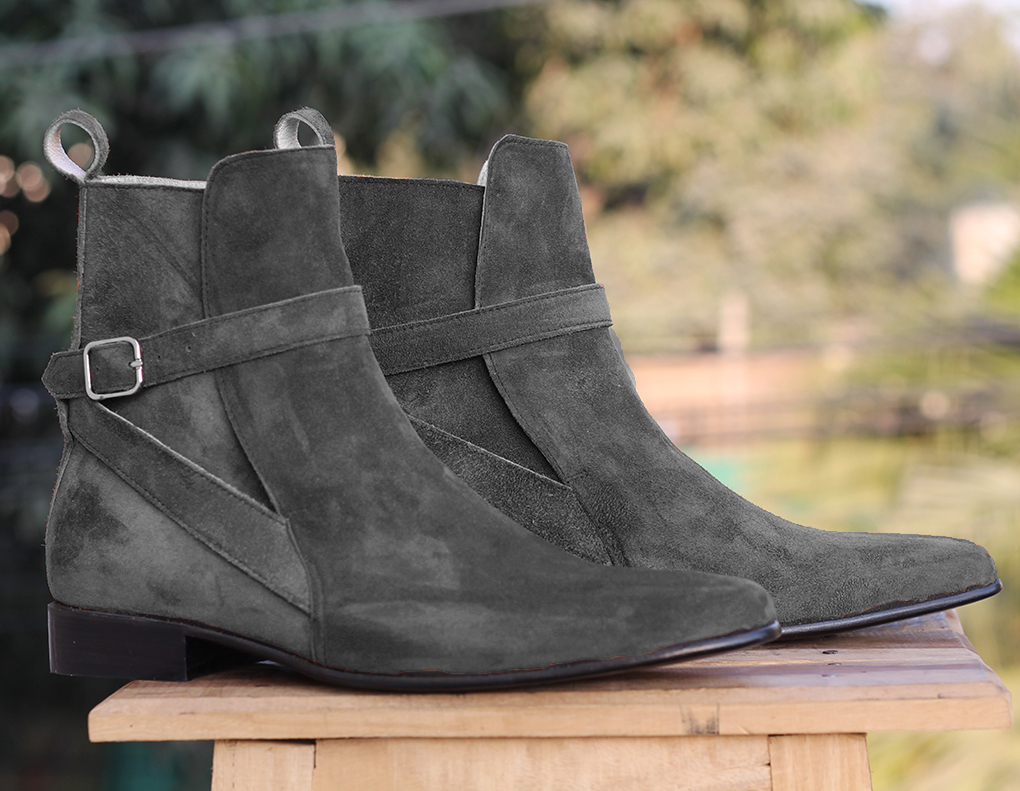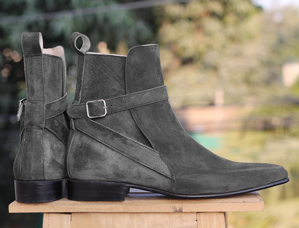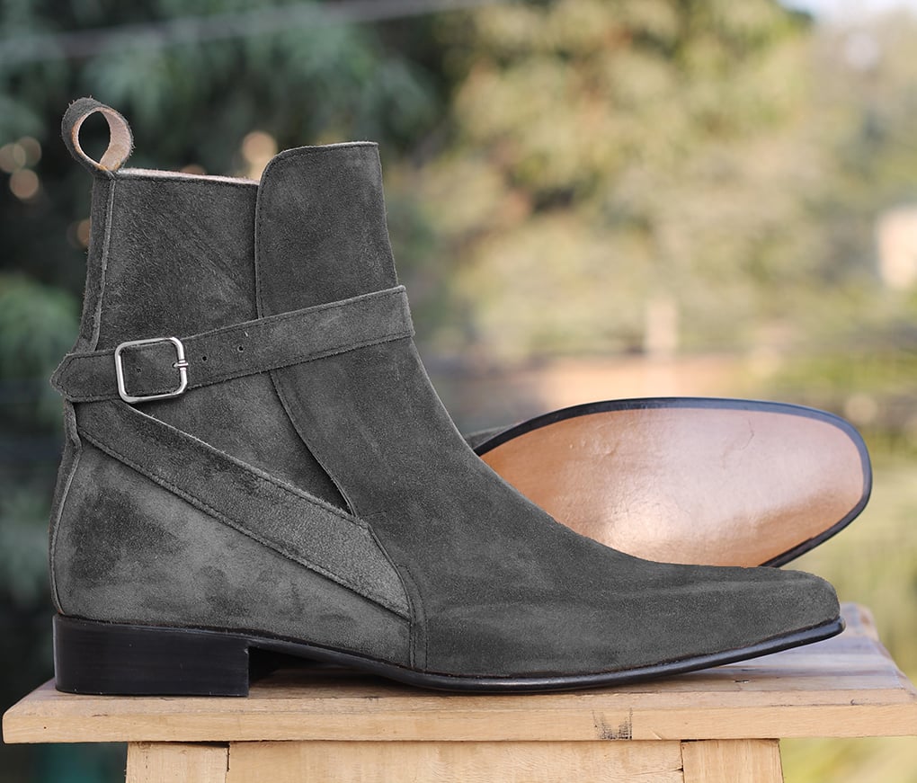 Men's Handmade Gray Ankle Boots, Buckle Suede Designer Boots for Men