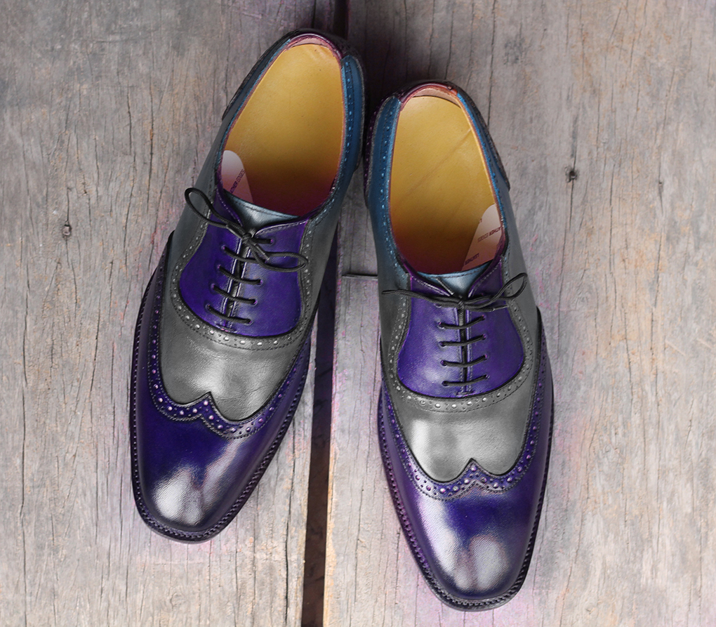 Handmade Gray Navy Blue Wing Tip Leather Lace Up Shoes For Men's