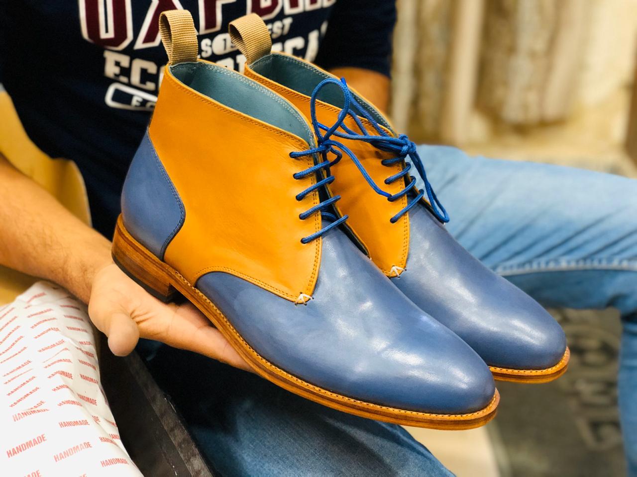 New Handmade Half Ankle Blue & Tan Leather Lace Up Boot For Men's