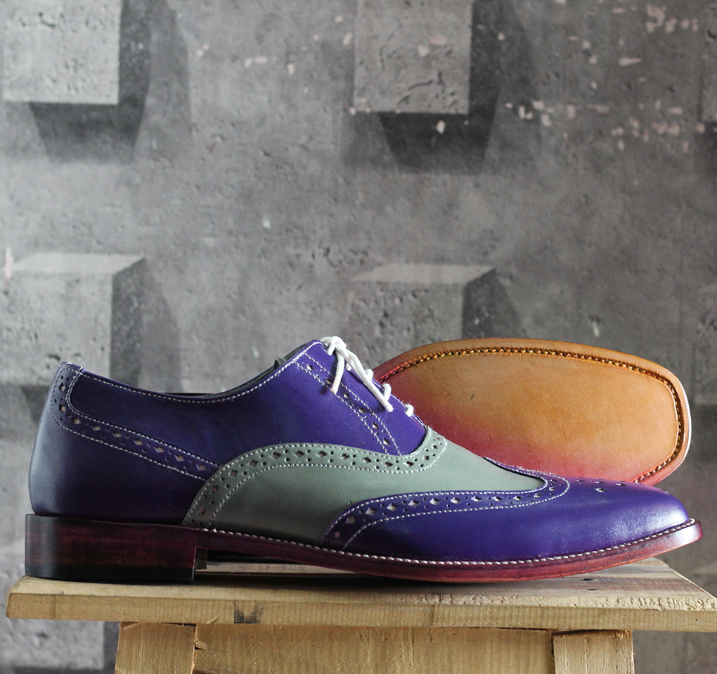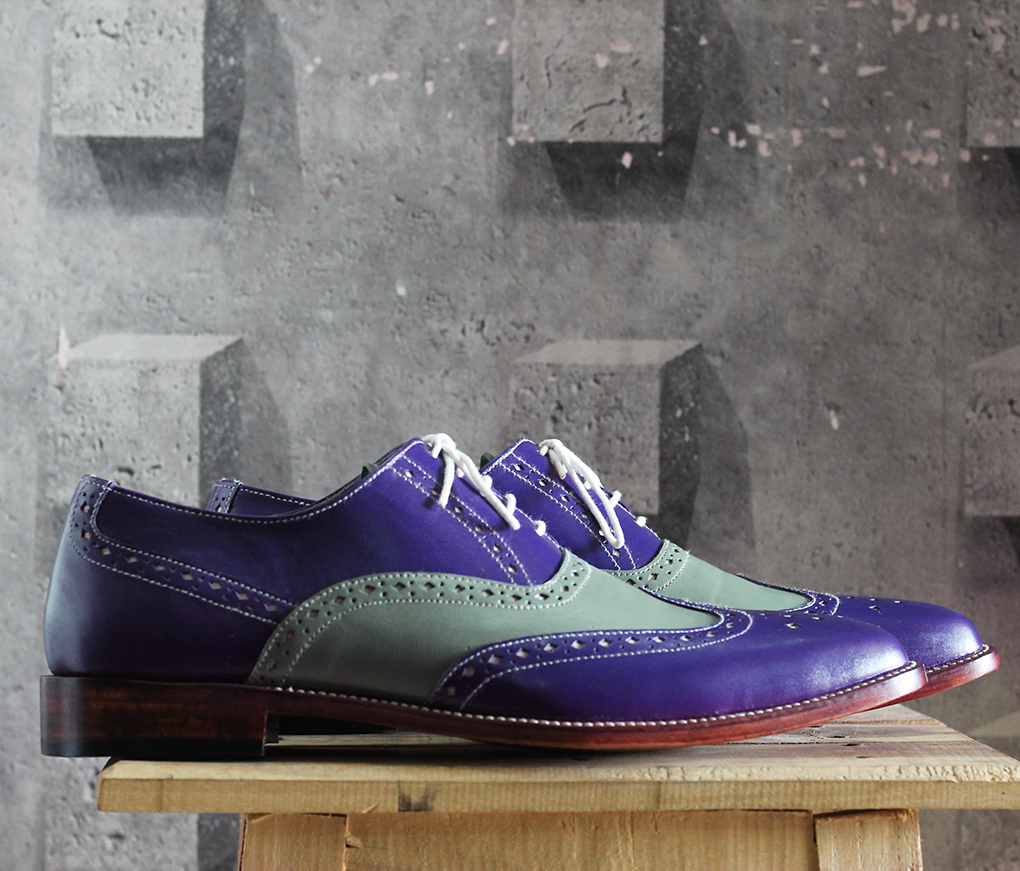 Men's Handmade Blue & Gray Wing Tip Brogue Lace Up Leather Shoes