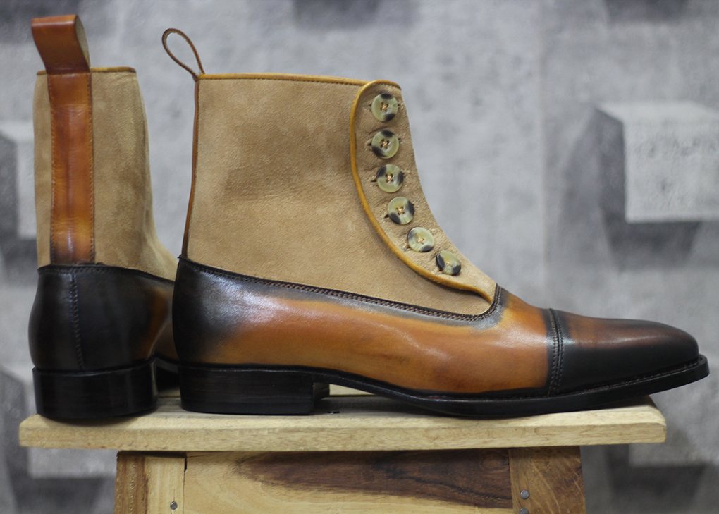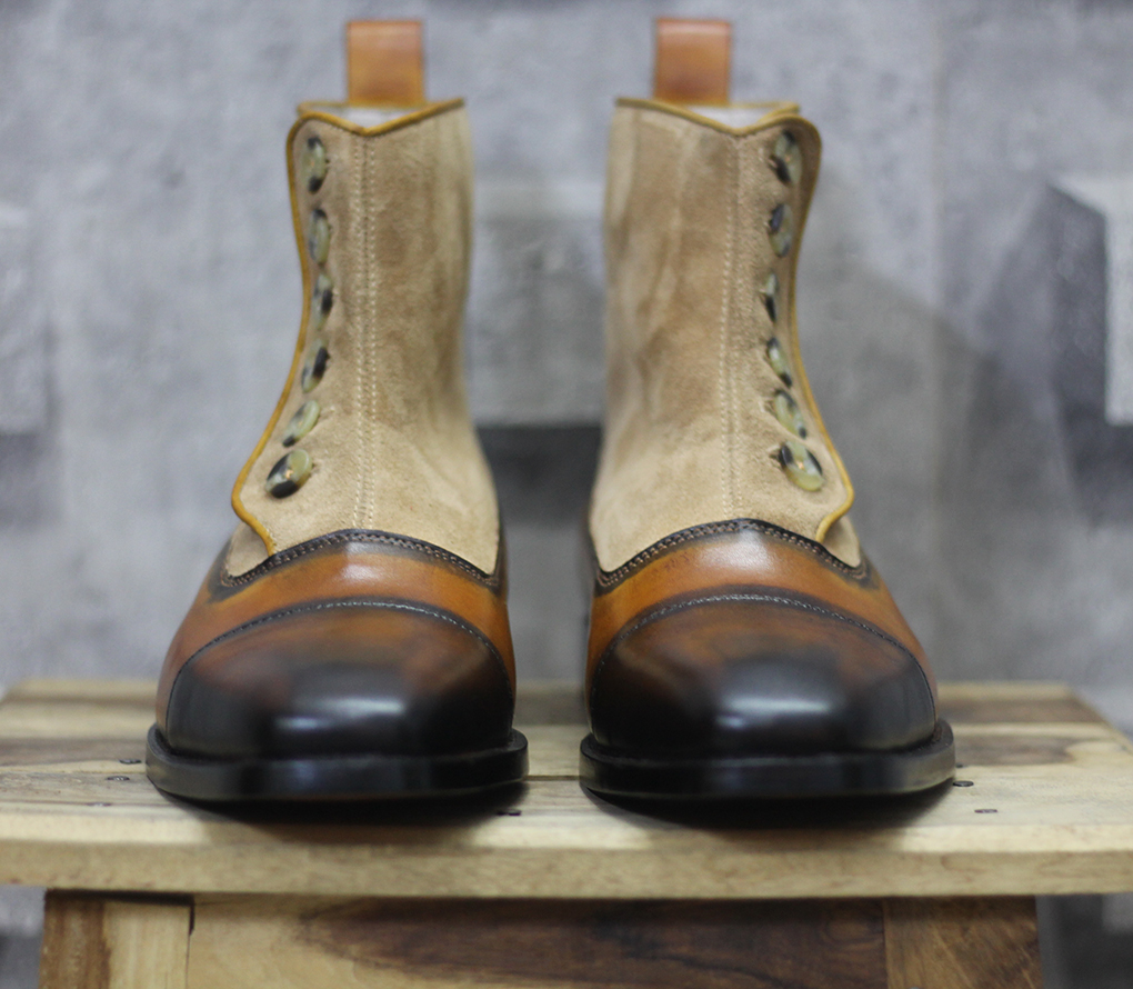 Men's Handmade Tone Brown & Beige Ankle Button Top Cap Toe Leather & Suede Boots