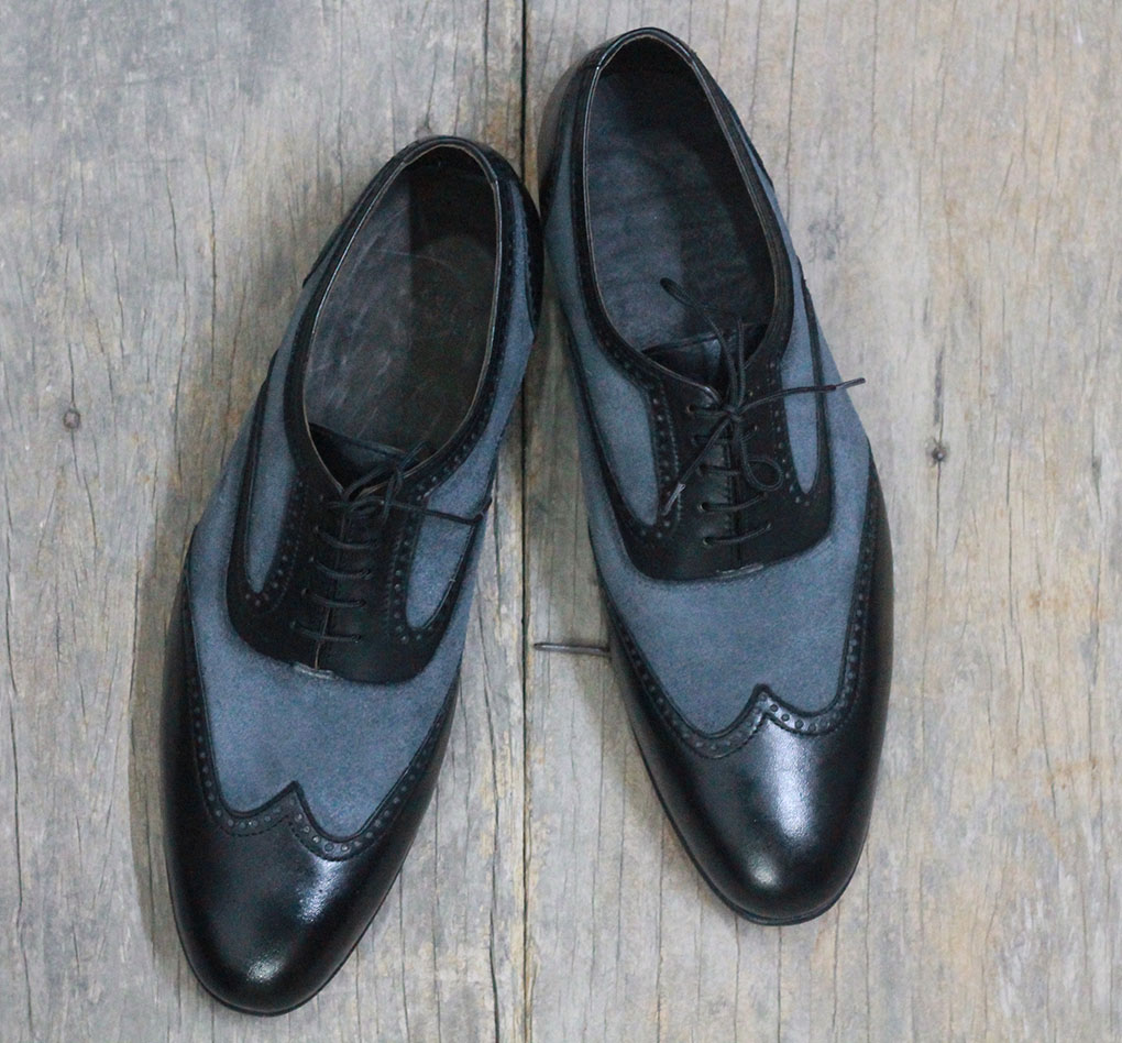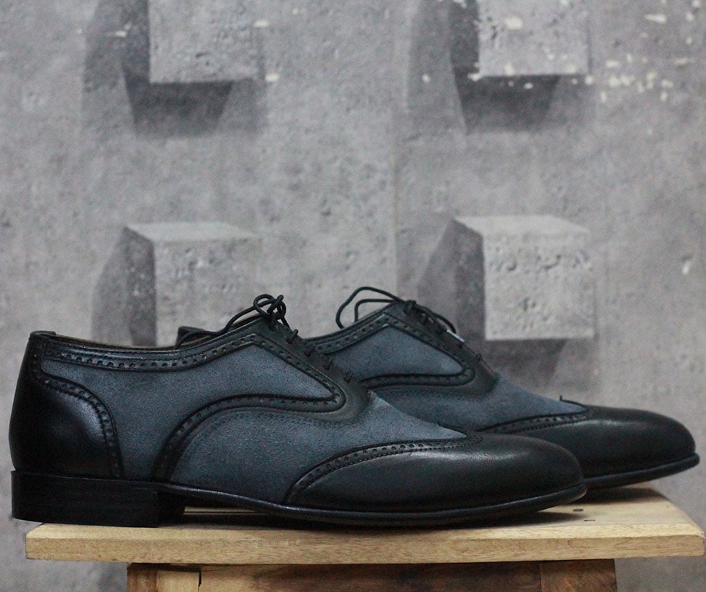 Men's Handmade Black & Gray Wing Tip Leather Suede Shoes