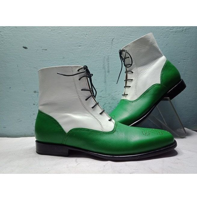 Handmade White Green Brogue Ankle Boots Men's Leather Boots