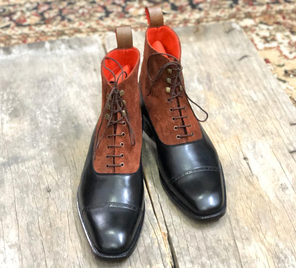 Men's Handmade Brown Black Cap Toe Leather Suede Lace Up Boot