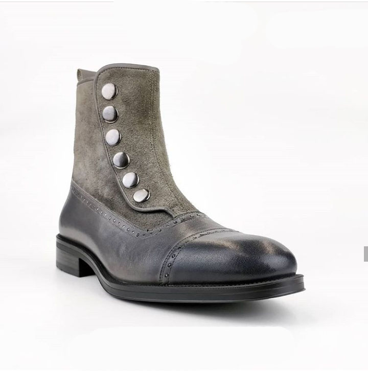 Men's Ankle Boots Gray Button Top & Side Zipper Leather Suede Boot