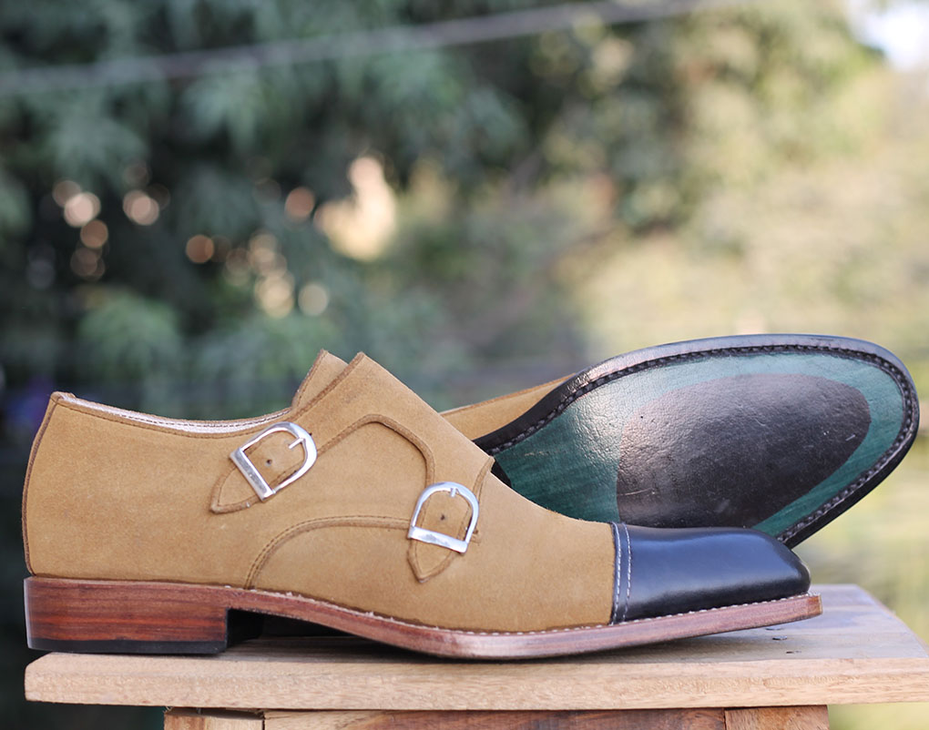 Men's Handmade Beige Black Cap Toe Double Monk Strap Leather Suede Shoes
