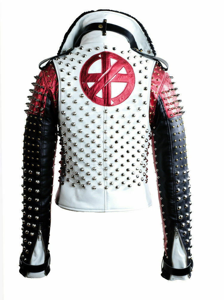 Men's Handmade Victor Luna White Black Studded Rock Punk Genuine Leather Jacket