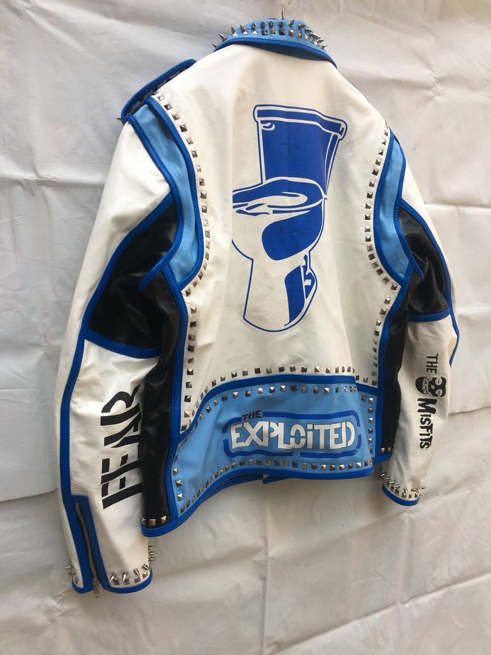 Men's silver studded genuine leather jacket, Rock punk blue white biker jacket