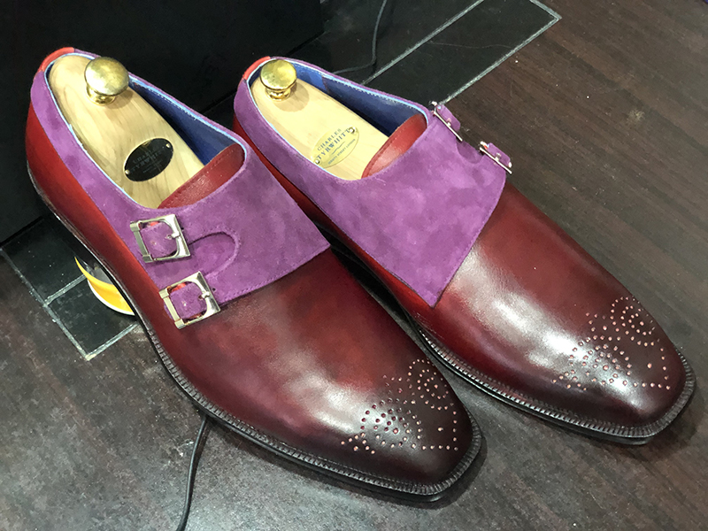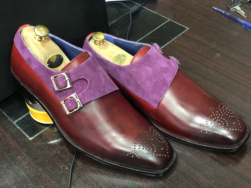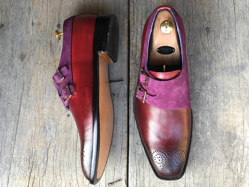 Men's Handmade Burgundy Purple Suede Leather Double Monk Shoes