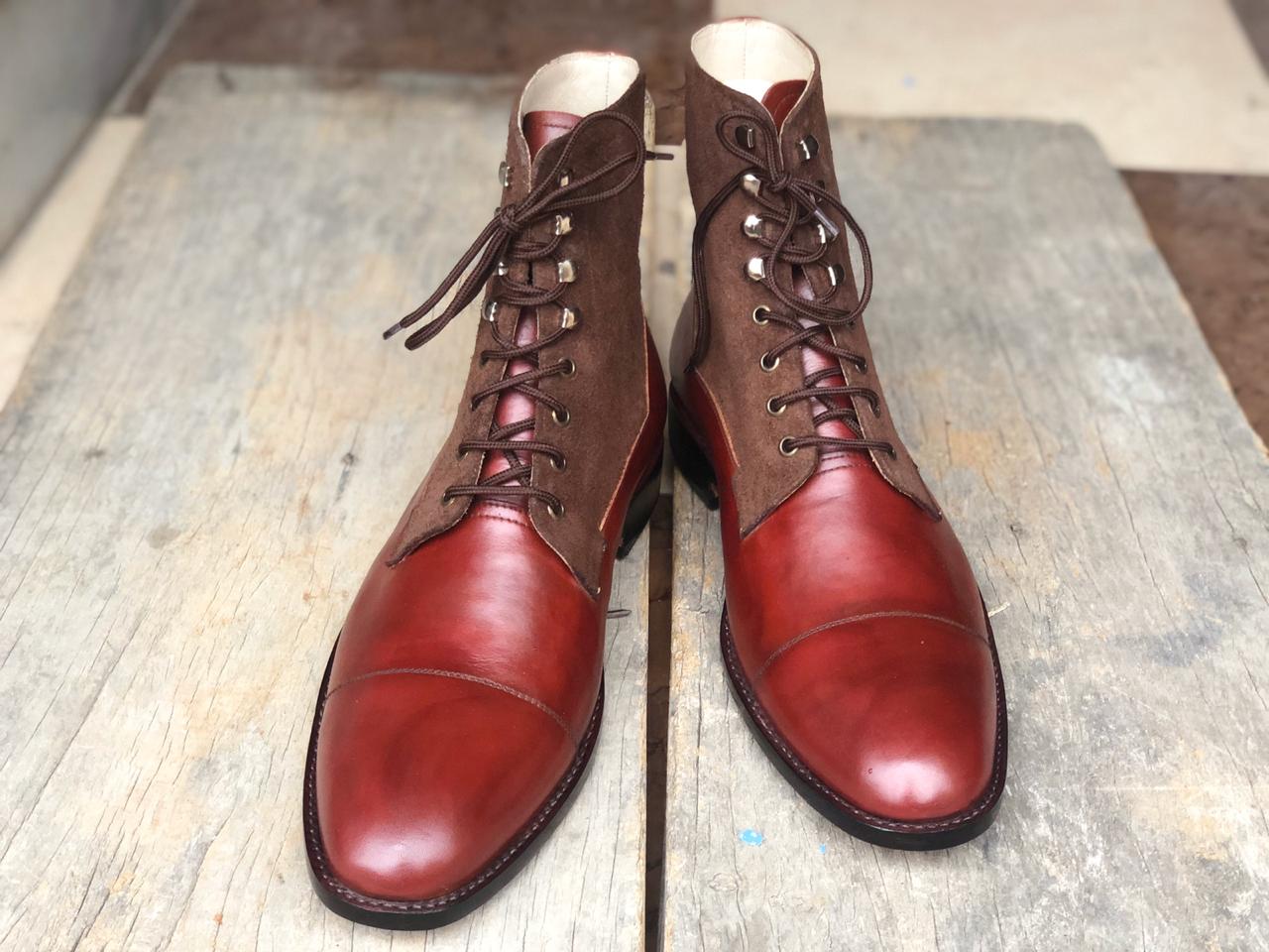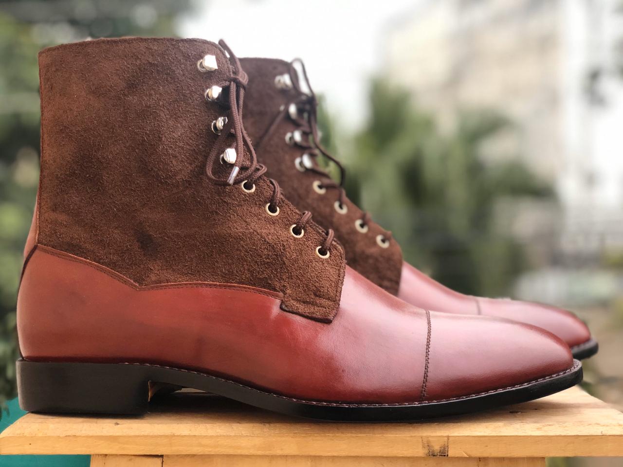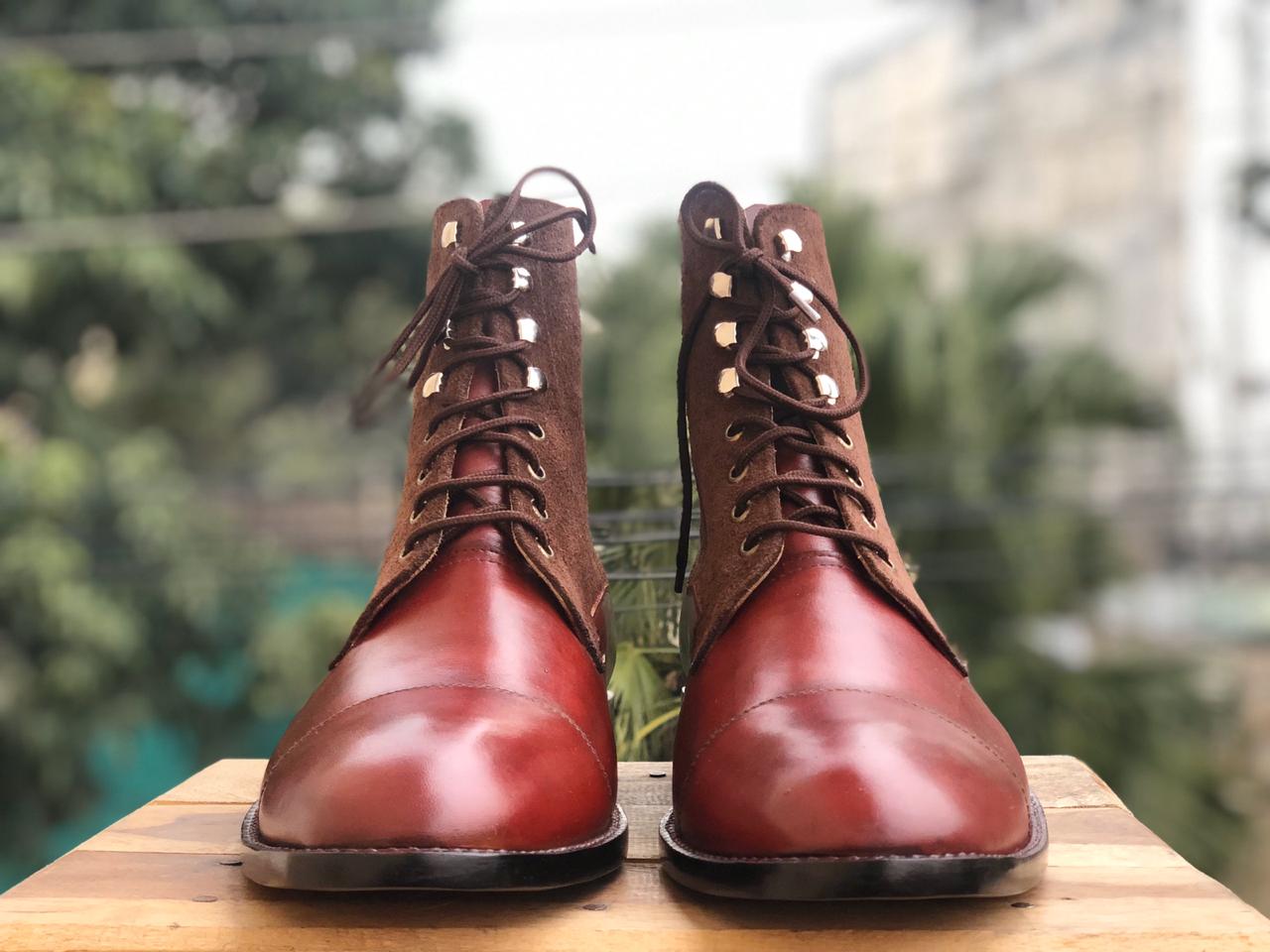 Men's Handmade Ankle High Brown Cap Toe Leather Suede Lace Up Boot