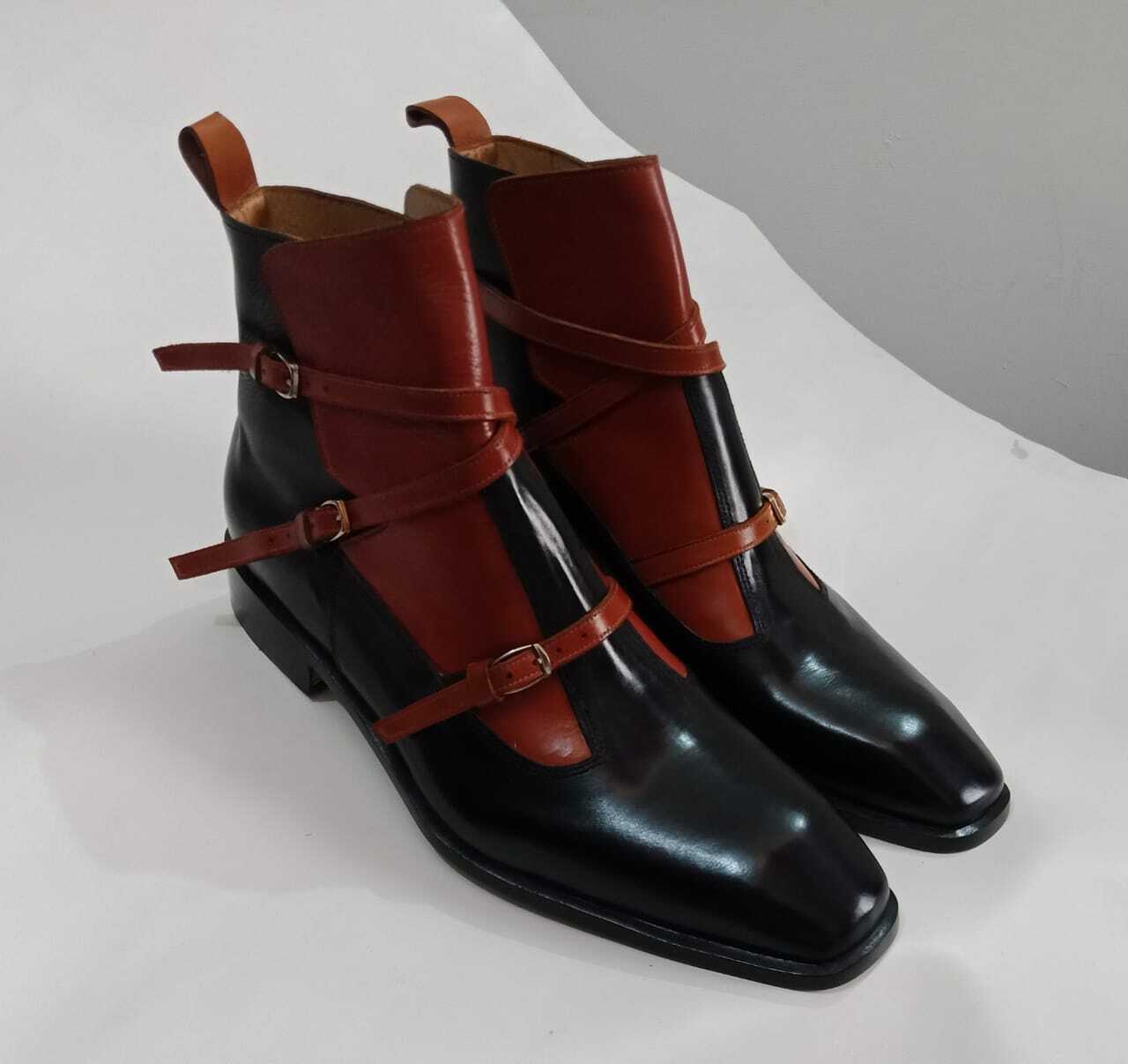 Men's Handmade Ankle High 2 Tone Triple Monk Straps Style Leather Boot