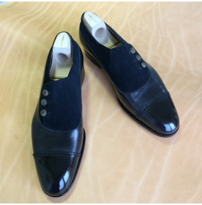 Handmade Navy Blue Cap Toe Leather Suede Button Top Shoes For Men's