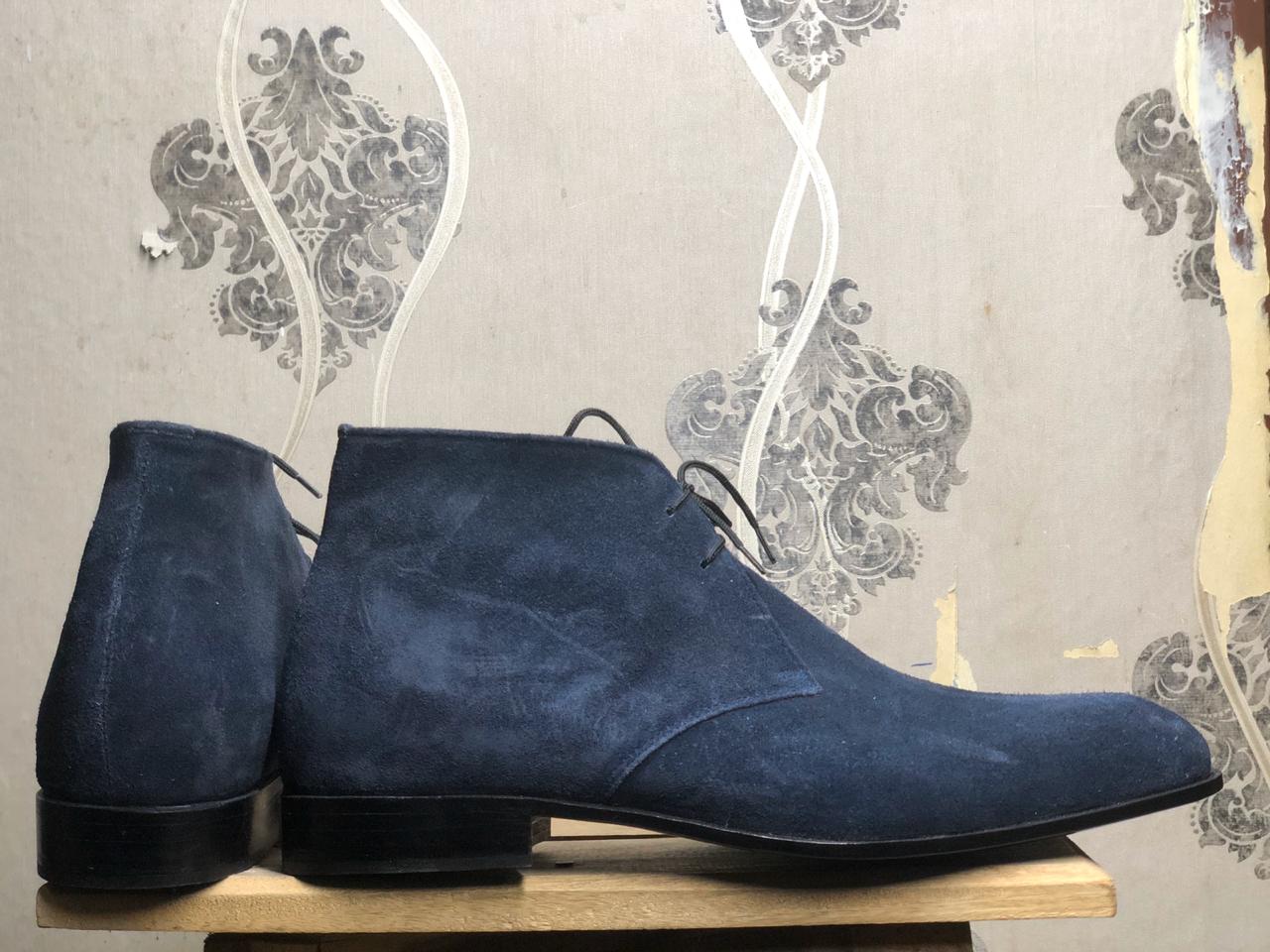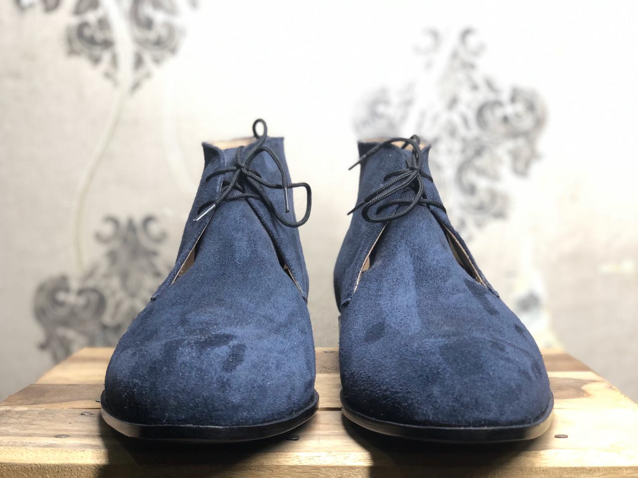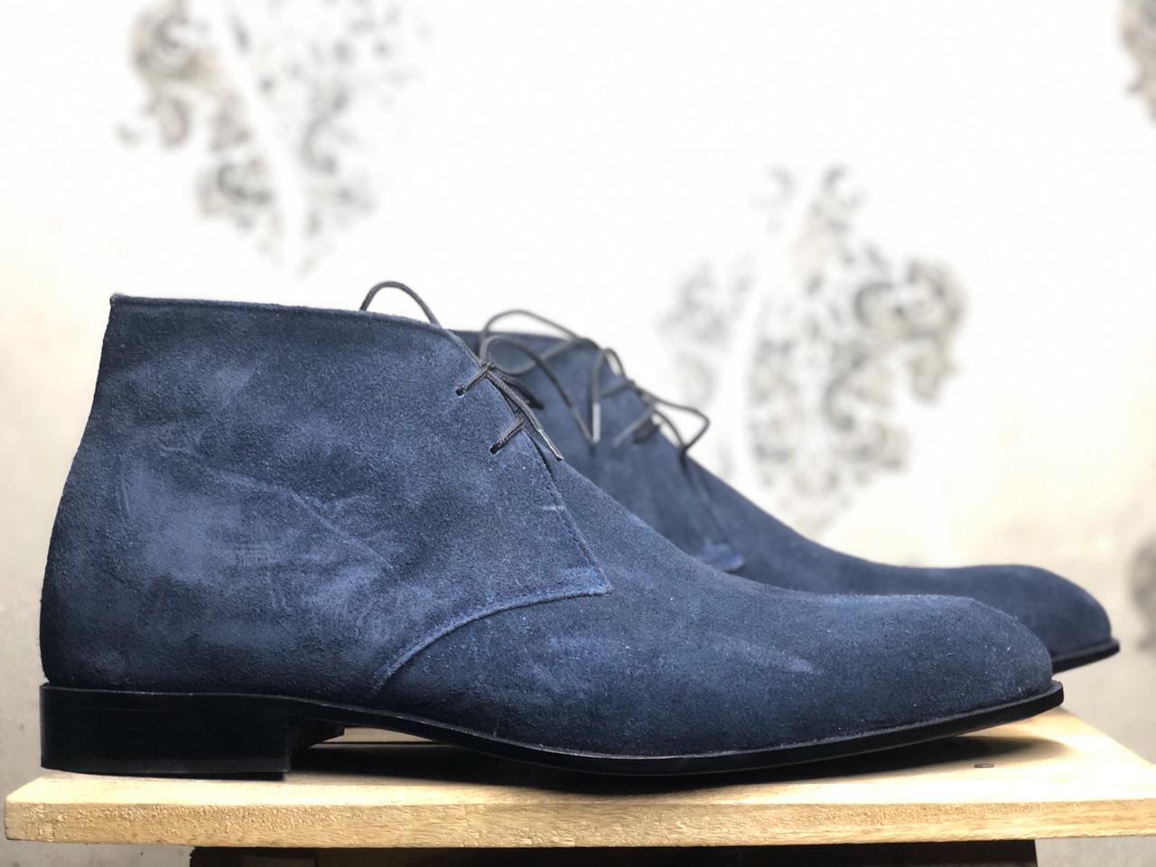 Men's Handmade Half Ankle Navy Blue Suede Lace Up Boot