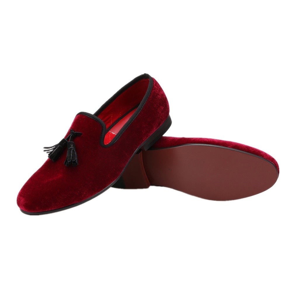 Men's Handmade Burgundy Velvet Tussles Loafers Shoes