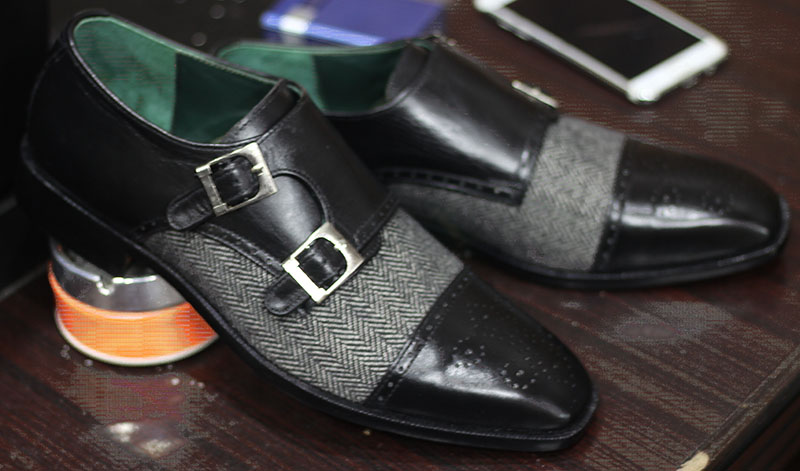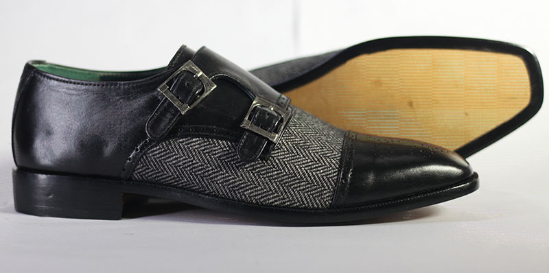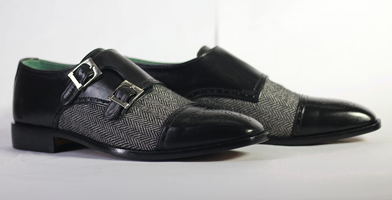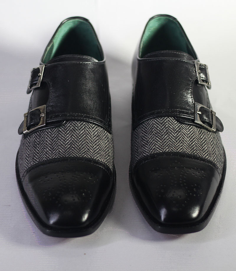 Men's Handmade Black Denim & Leather Double Monk Shoes