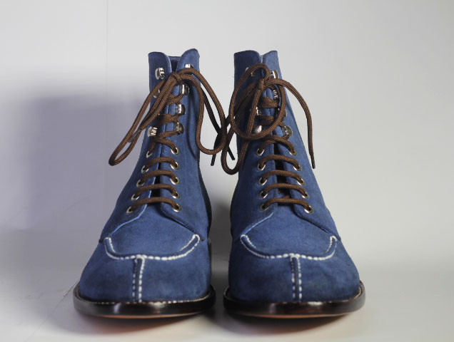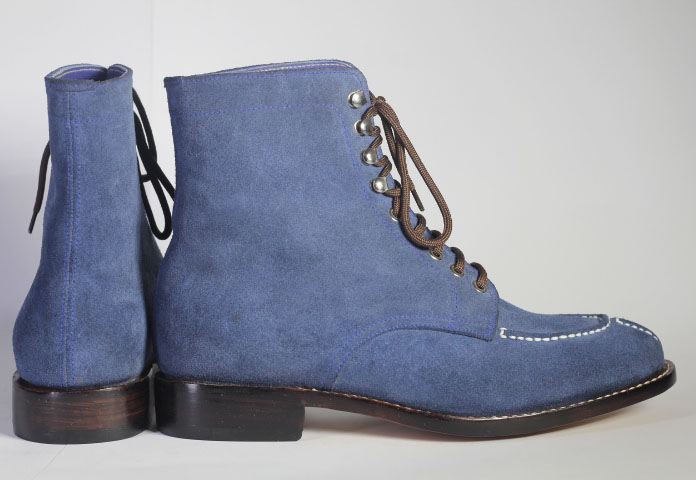Men's Handmade Ankle High Blue Split Toe Suede Lace Up Boot