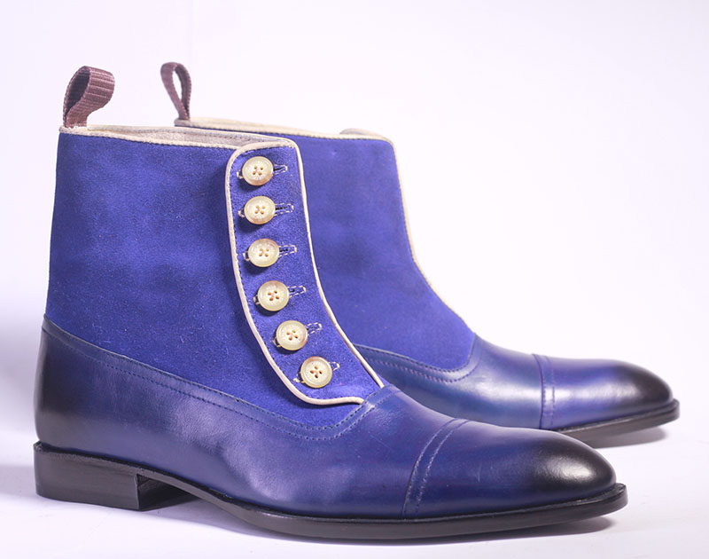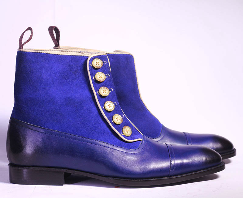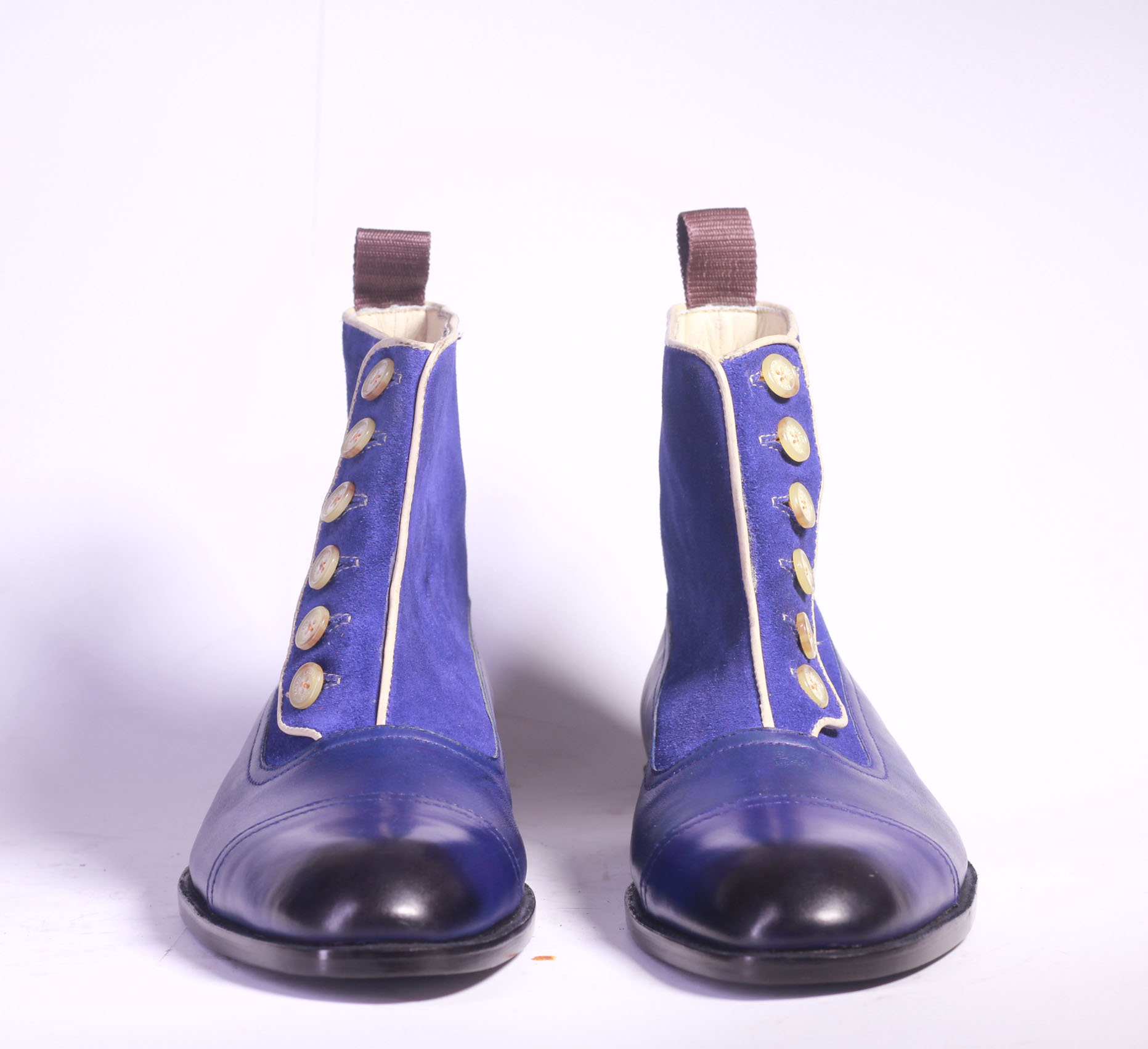 Men's Ankle High Blue Cap Toe Leather Suede Button Top Boot