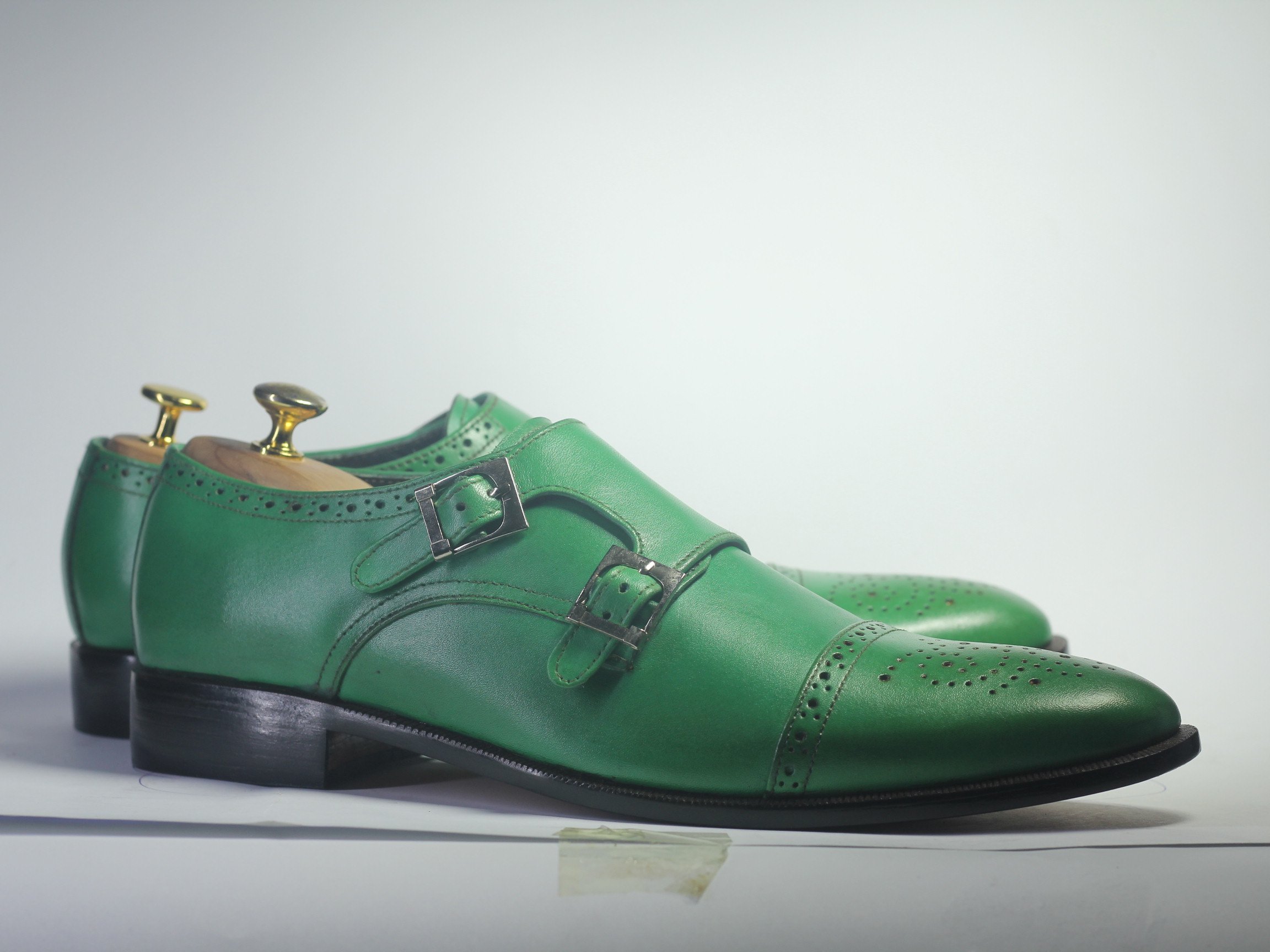Handmade Green Cap Toe Brogue Leather Double Monk Shoes For Men's