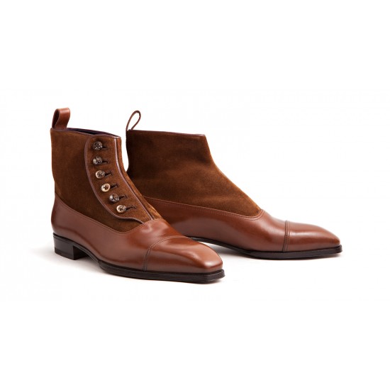 Men's Handmade Brown Ankle High Cap Toe Button Top Leather Suede Boot