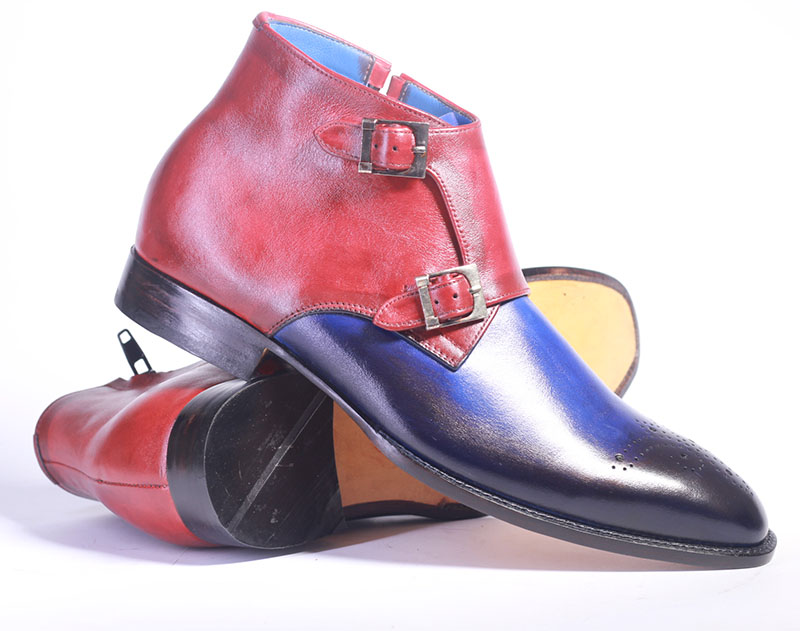 Handmade Blue & Burgundy Leather Double Monk Shoes For Men's