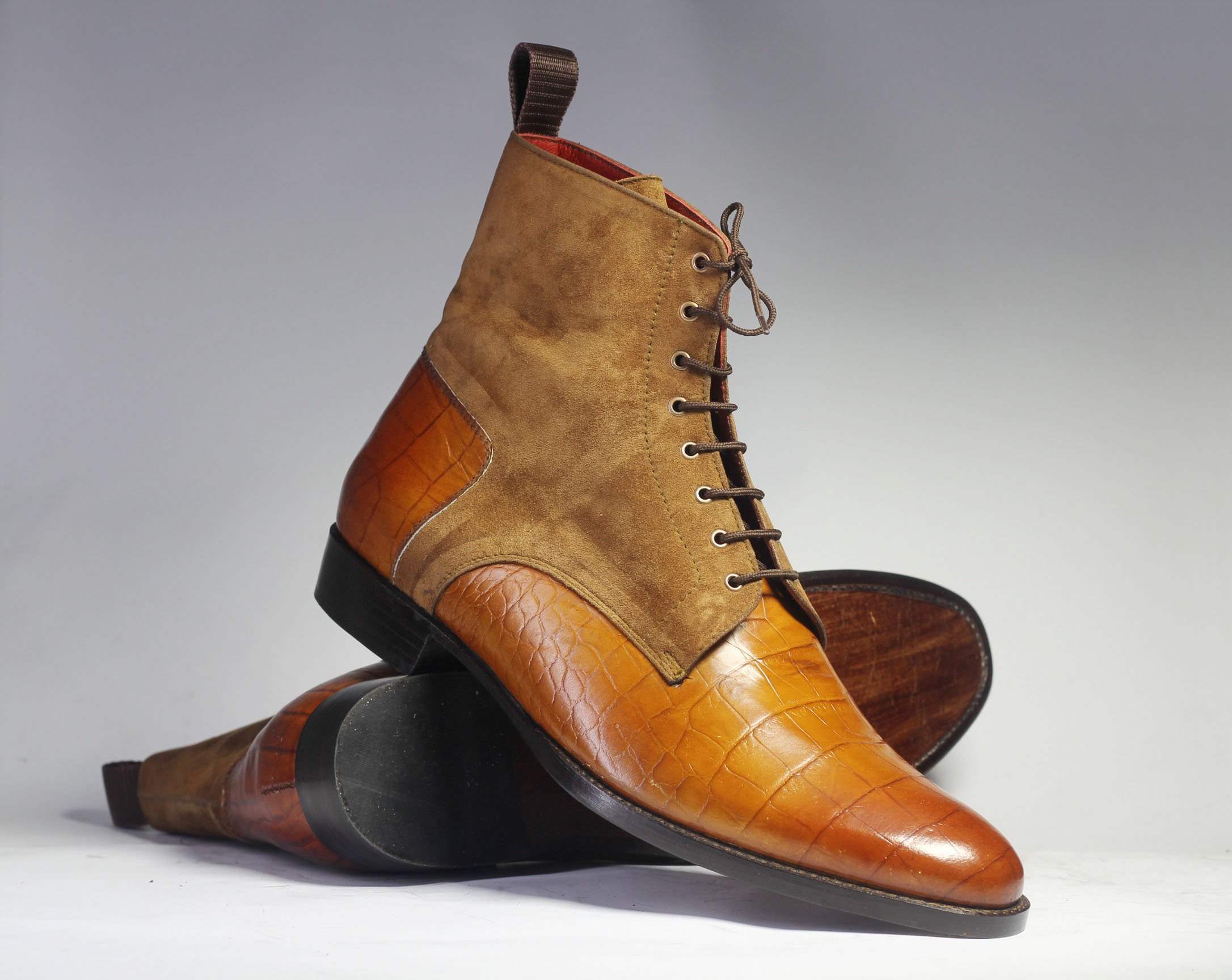 Men's Handmade Tan Brown High Ankle Crocodile Leather & Suede Lace Up Boot