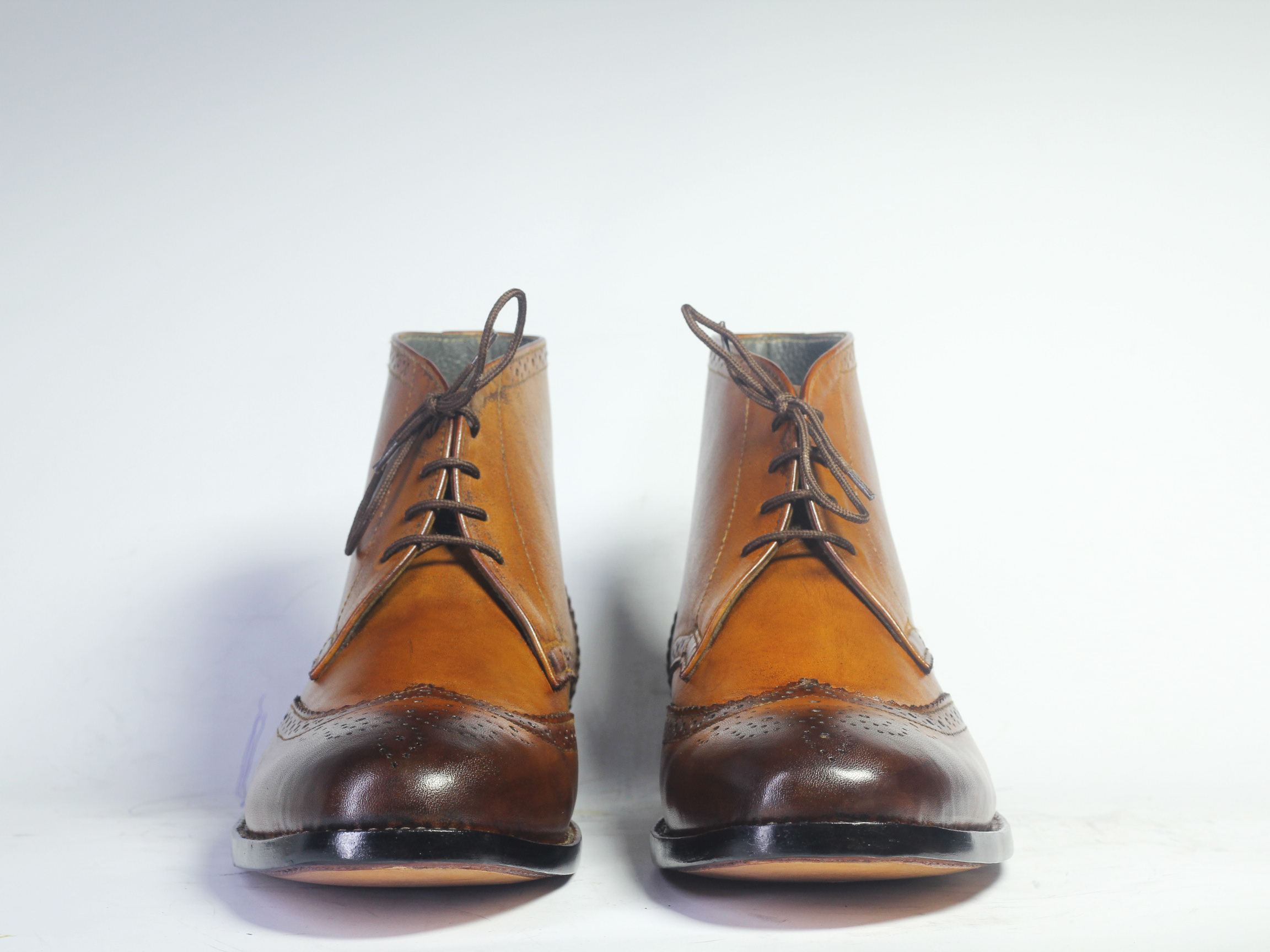 Handmade Brown Ankle High Wing Tip Brogue Leather Boot For Men's