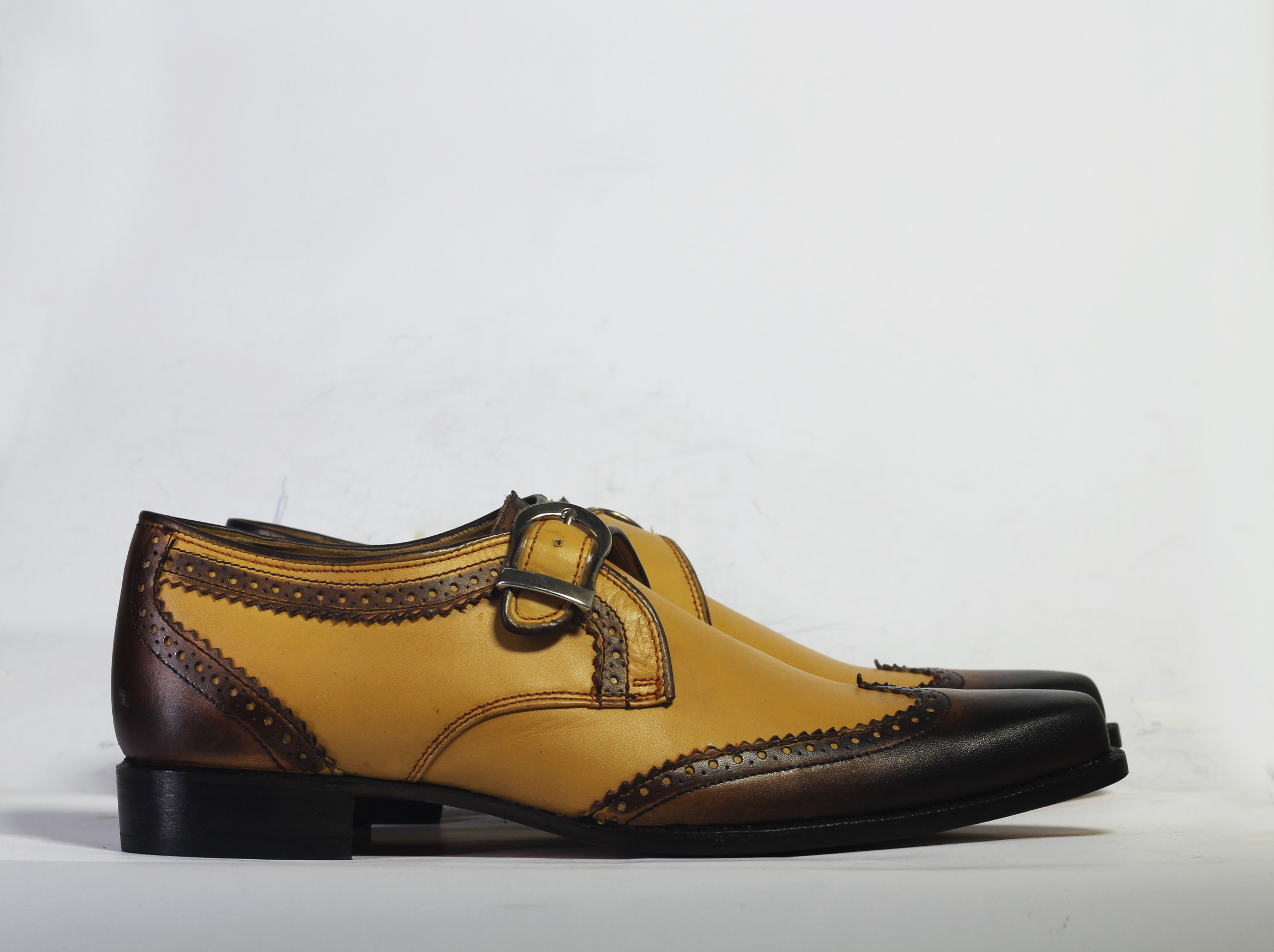 Handmade Tan & Brown Wing Tip Monk Steps Leather Shoes