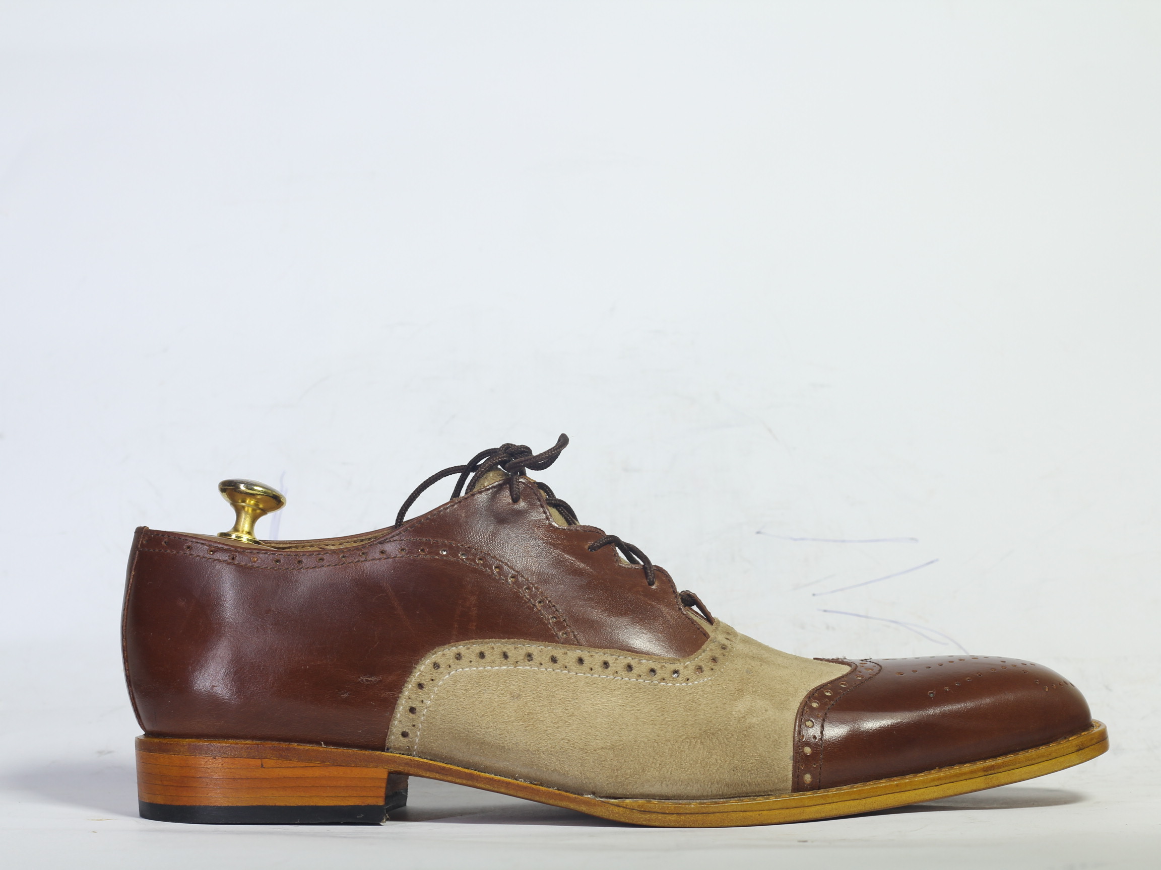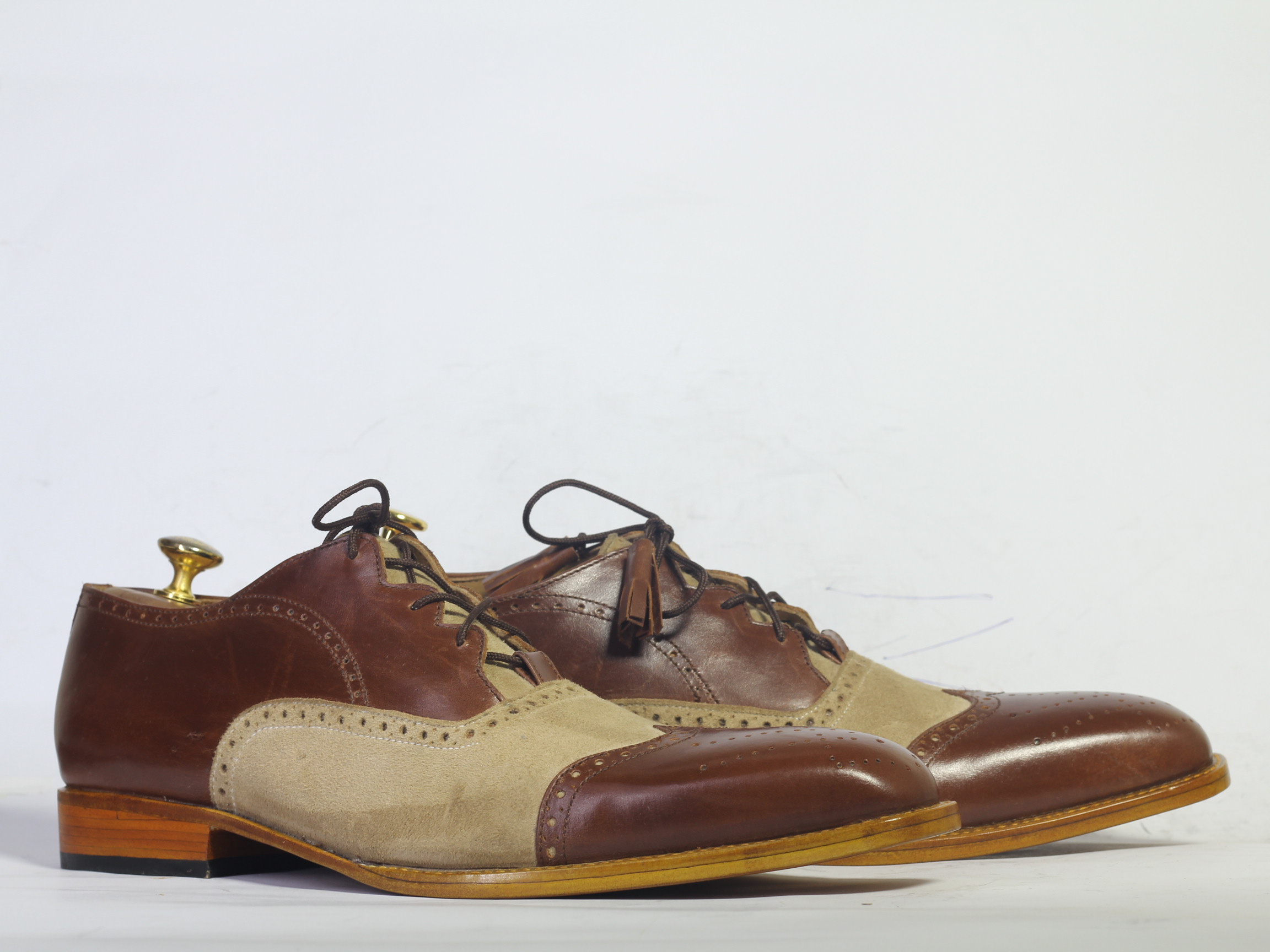 Handmade Beige & Brown Wing Tip Lace Up Leather & Suede Shoes For Men's