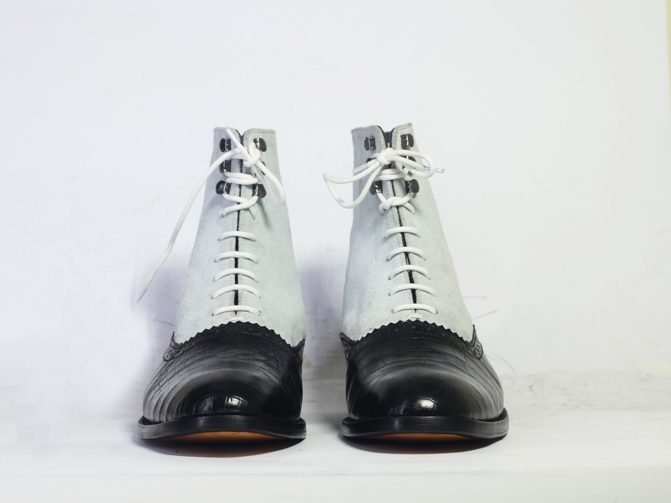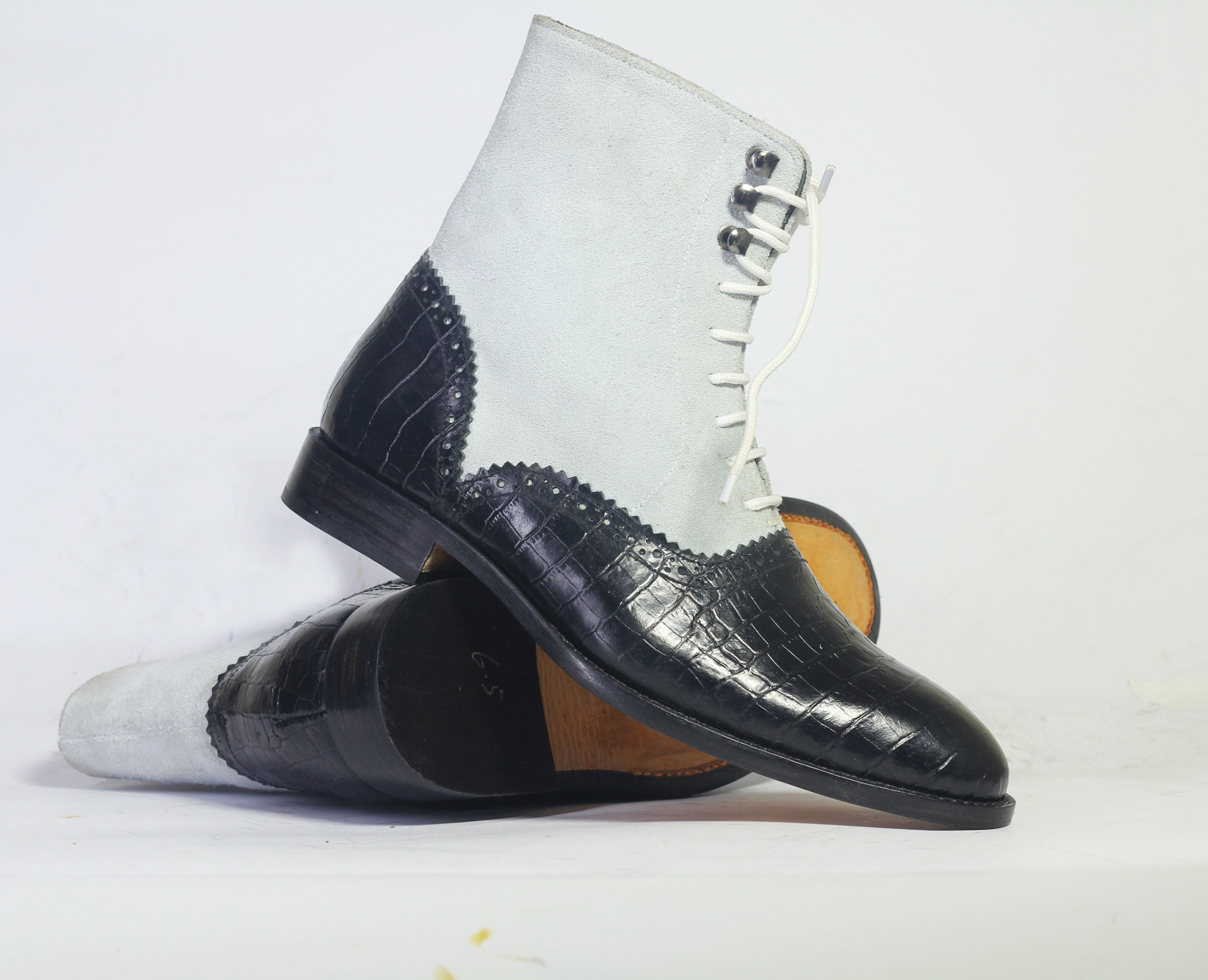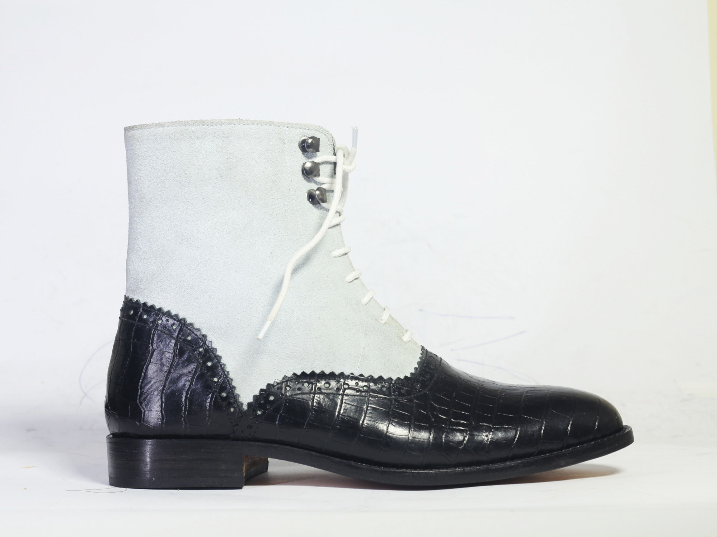 Handmade White & Black Ankle High Alligator Leather Suede Lace Up Boot For Men's