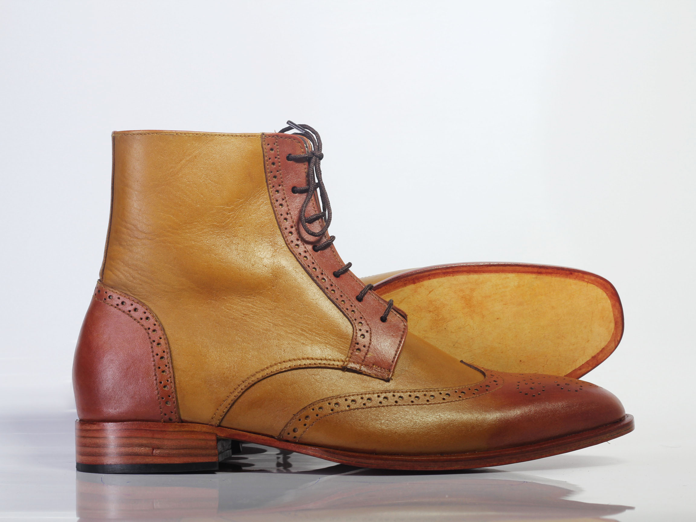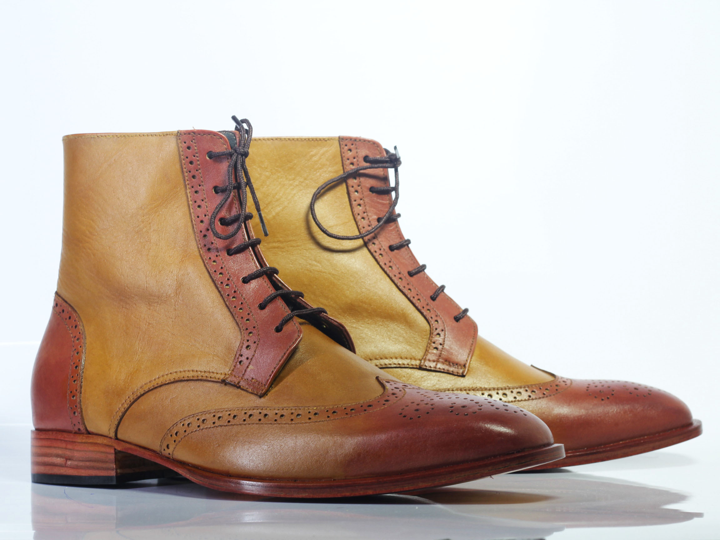Handmade Tan Ankle High Wing Tip Brogue Leather Lace Up Boot For Men's